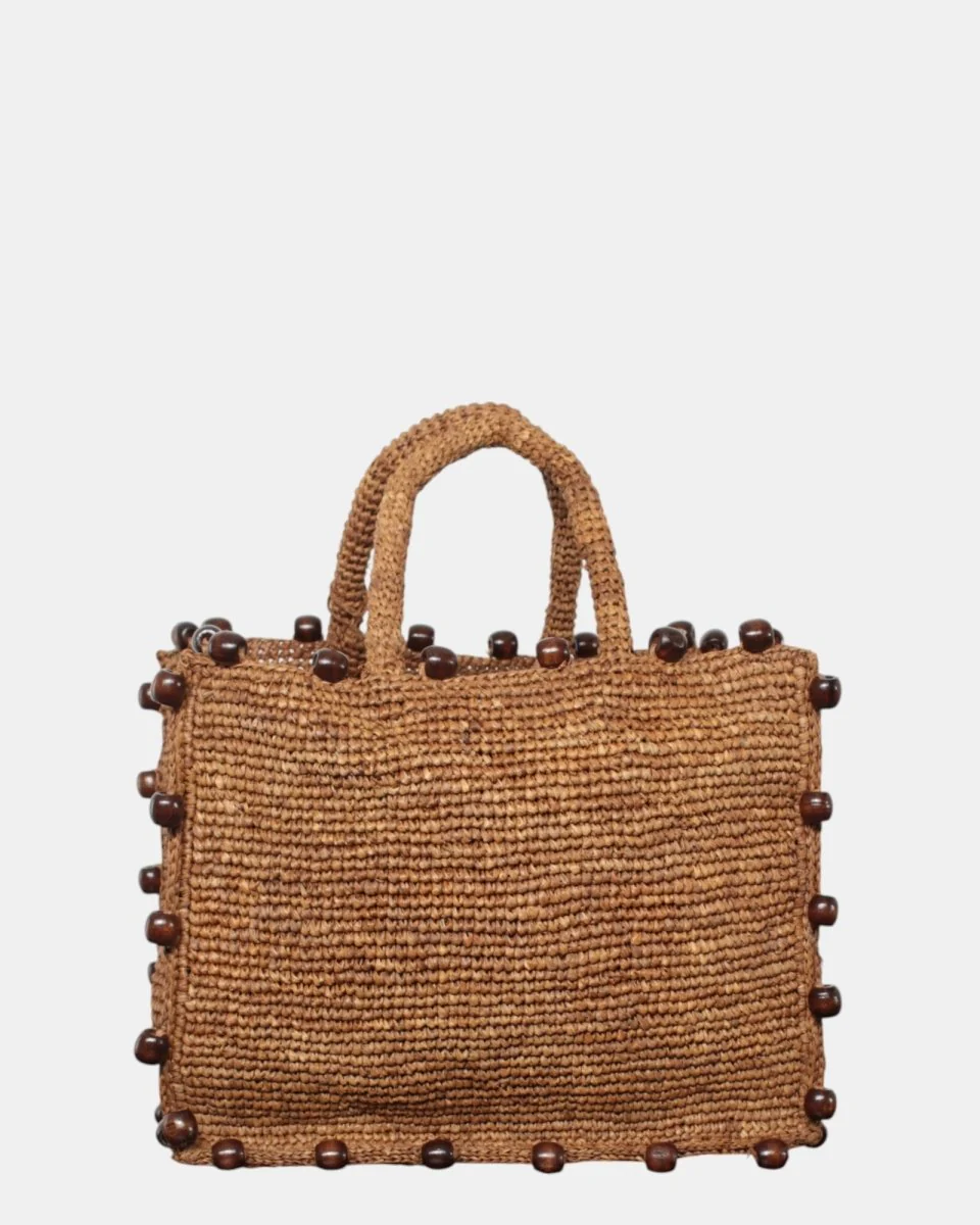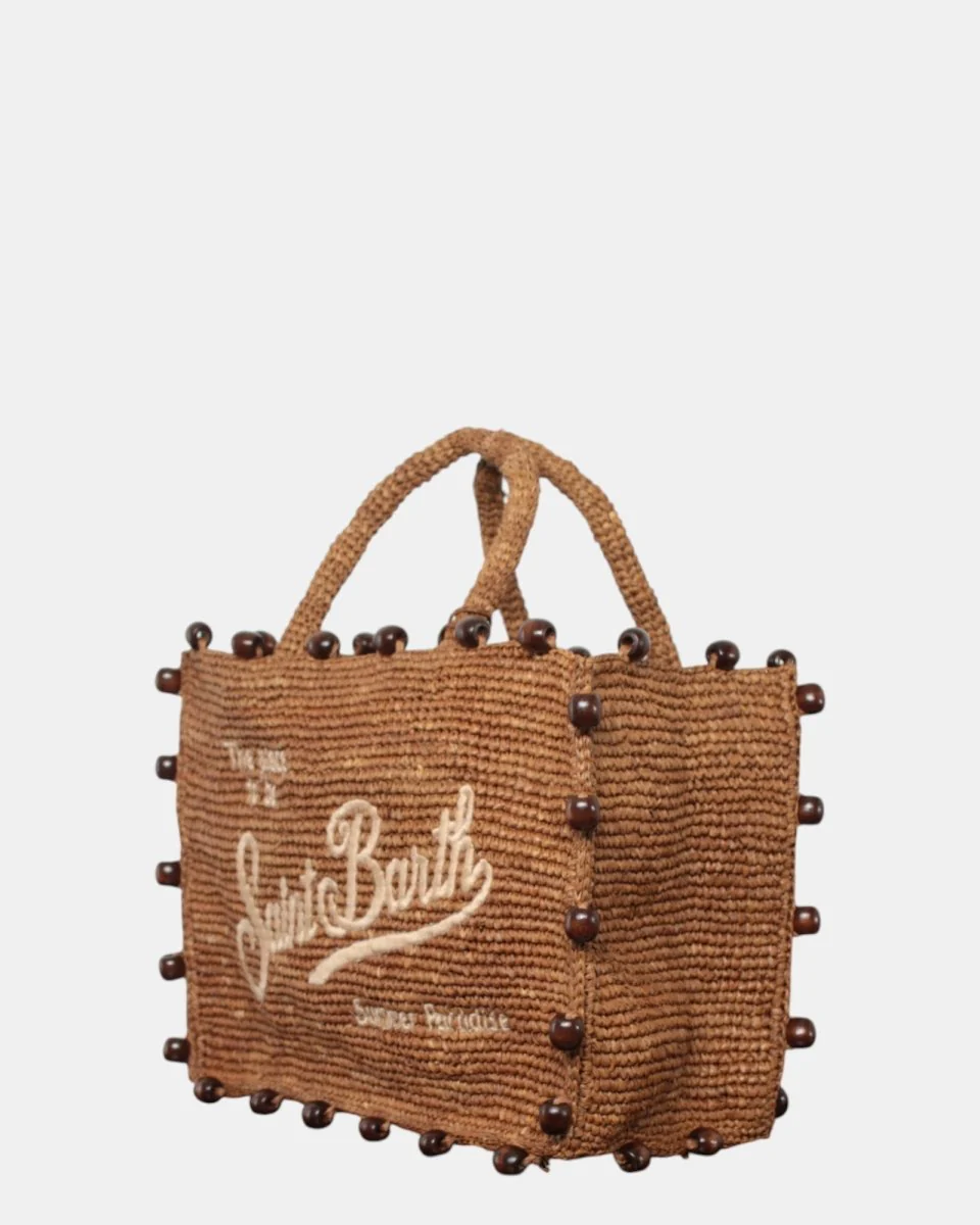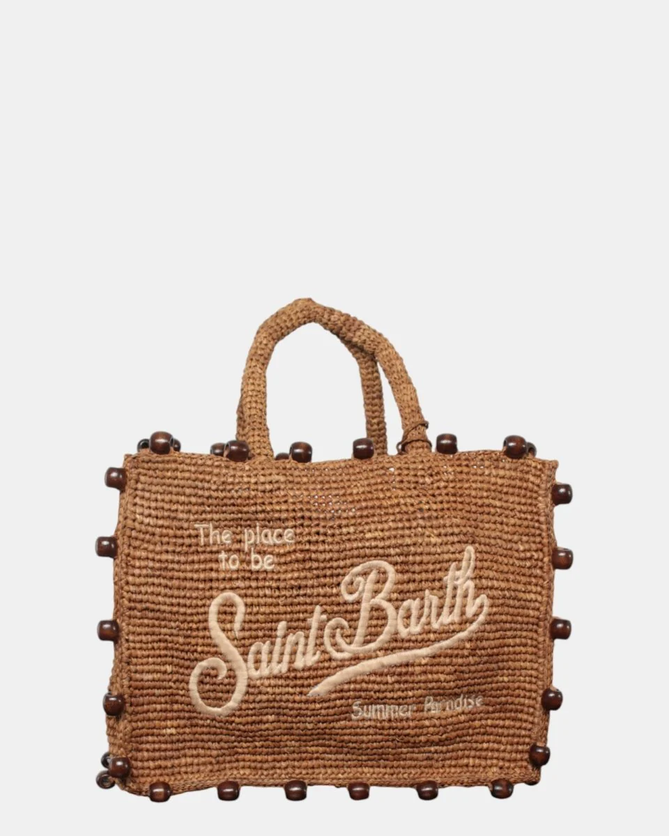 -DETTAGLI:realizzata in autentica rafia, presenta una tinta unita marrone, applicazione di perline decorative, esclusivo logo Saint Barth ricamato sul fronte, design non strutturato e non foderato, con pratica tasca interna dotata.