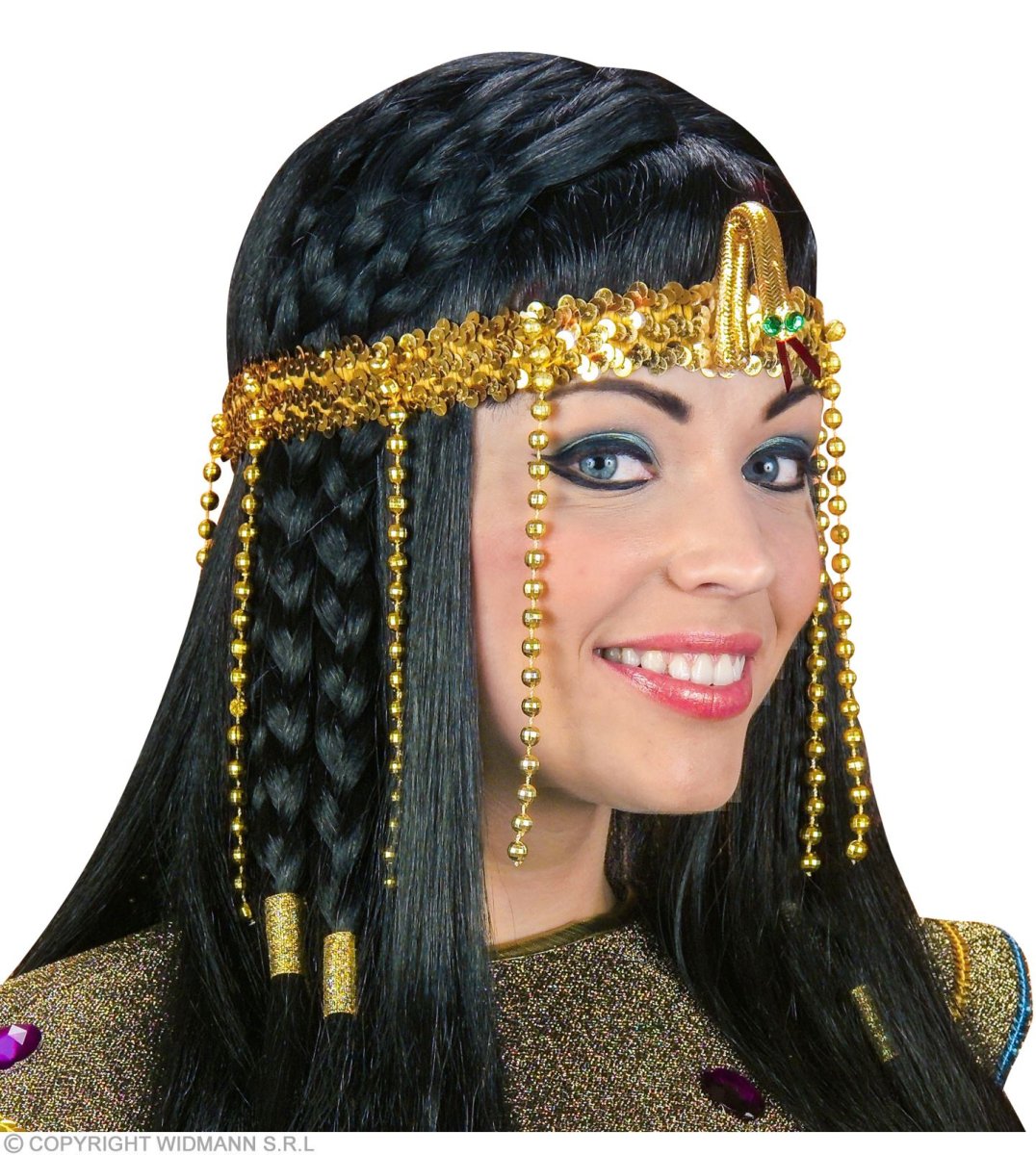 Un fascia egiziana dorata, ricoperta da paillettes dorate ed elastica ha la testa di un serprente sulla parte davanti.