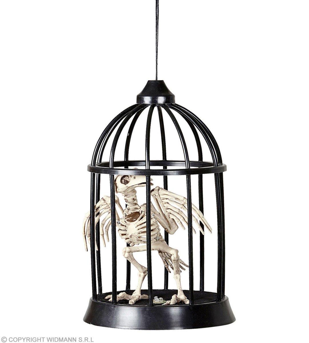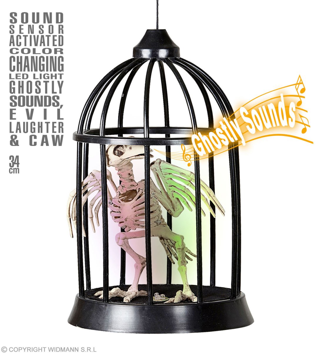 CORVO SCHELETRO IN GABBIA CON LUCE LED CAMBIACOLORE, SUONI SPIRITATI, RISATA MALVAGIA E GRACCHIO