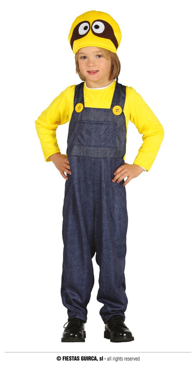 Costume da Minion giallo per bambino. Questo prodotto comprende i seguenti articoli: tuta (camicia con salopette attaccata) e cappello. Questo prodotto è indicato per i bambini.