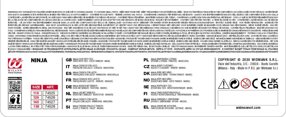WIDMANN COSTUME NINJA NERO . La confezione comprende: casacca con lacci, pantaloni con lacci, corazza, maschera. Sono esclusi gli accessori non menzionati.Abito,Travestimento,Carnevale,Comico,Halloween,cosplay
