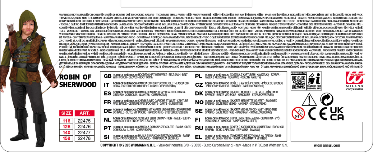 La confezione comprende: camicia con cappuccio e gilet, fascia con fibbia, cintura con marsupio, guanti, copristivali. Sono esclusi gli accessori non menzionati.