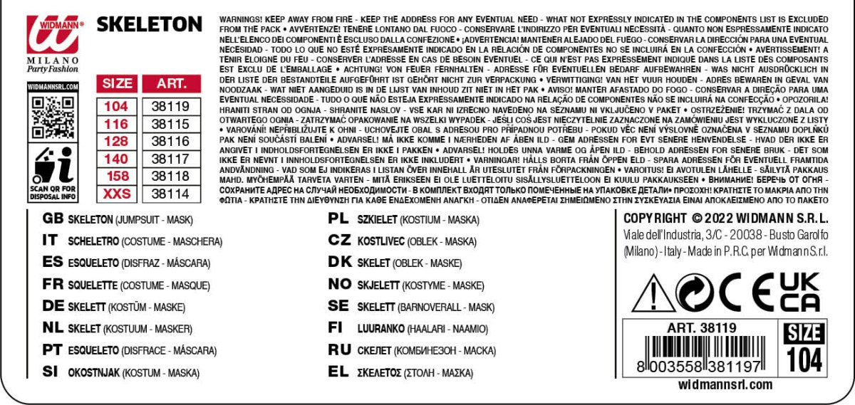 WIDMANN COSTUME SCHELETRO . La confezione comprende: costume, maschera. Sono esclusi gli accessori non menzionati.Abito,Travestimento,Carnevale,Comico,Halloween,cosplay