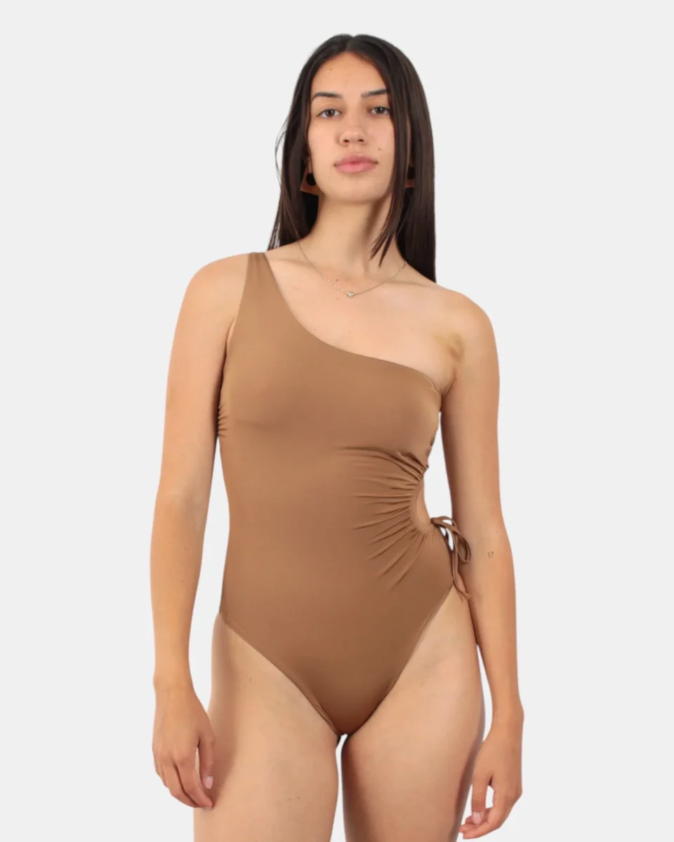 Il costume intero monospalla di Max Mara è realizzato in 90% poliammide e 10% elastan. Si consiglia il lavaggio a mano. La modella è alta 1,68 m e indossa una taglia I.