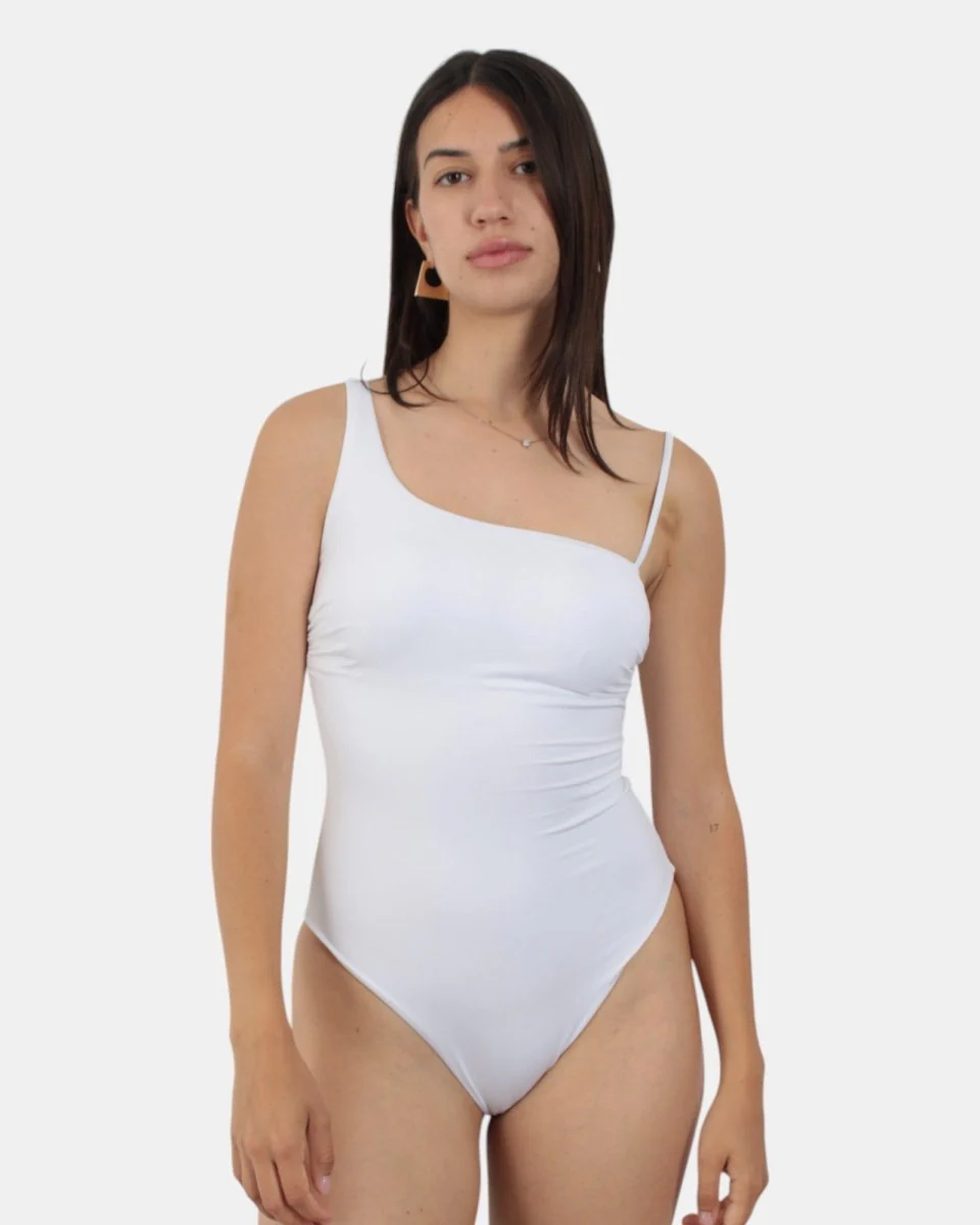 Il costume intero monospalla di Max Mara è realizzato in 90% poliammide e 10% elastan. Si consiglia il lavaggio a mano. La modella è alta 1,68 m e indossa una taglia II.