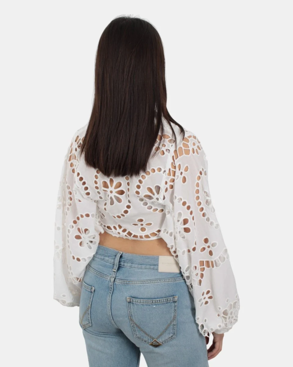 La camicia crop di MC2 Sainth Barth presenta fantasia traforata iconica brand, chiusura a tre bottoni con fiocchetto, dalla mano fresca dovuta alla sua composizione in 100% cotone. Si consiglia lavaggio a massimo 30 gradi. La modella è alta 1,68 m e indossa una XS