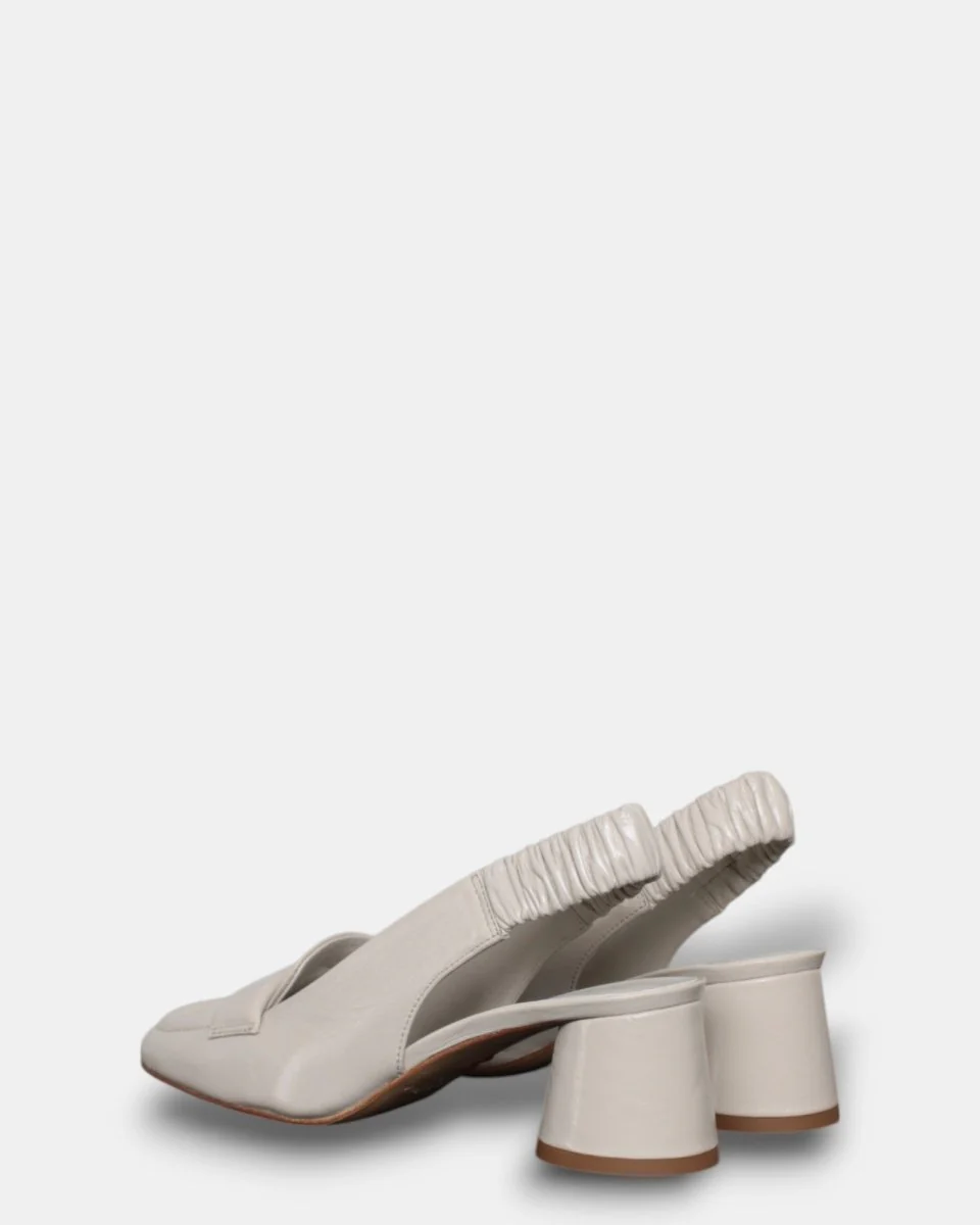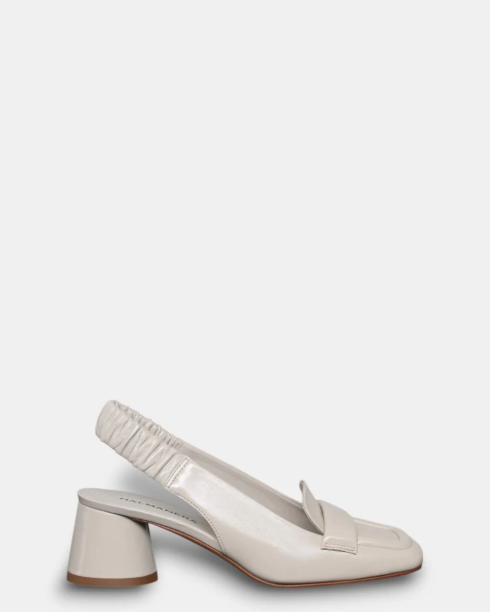 Il decolletè di Halmanera presenta tomaia in pelle effetto vernice, elastico sul tacco, tacco 5 cm, suola in cuoio, calzata comoda