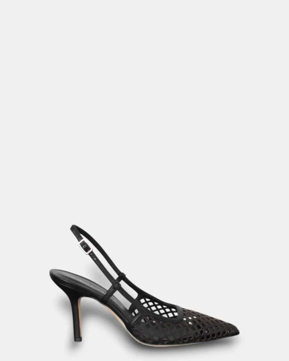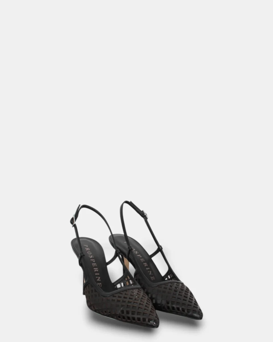 Il dècolletè di Prosperine presenta tacco, fantasia retinata con punta in vernice, cinturino sulla caviglia con fibietta argentata, suola in cuoio. Calzata regolare