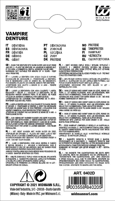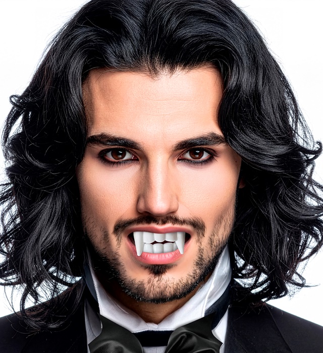 La finta dentiera da vampiro e in materiale plastico di colore bianco misura per adulto effetto travestimento vampiro.