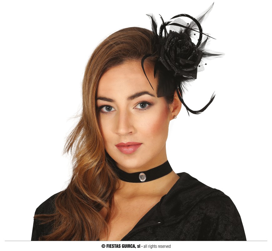 Diadema a clip fiore rosa nera con piume e perline 10 cm