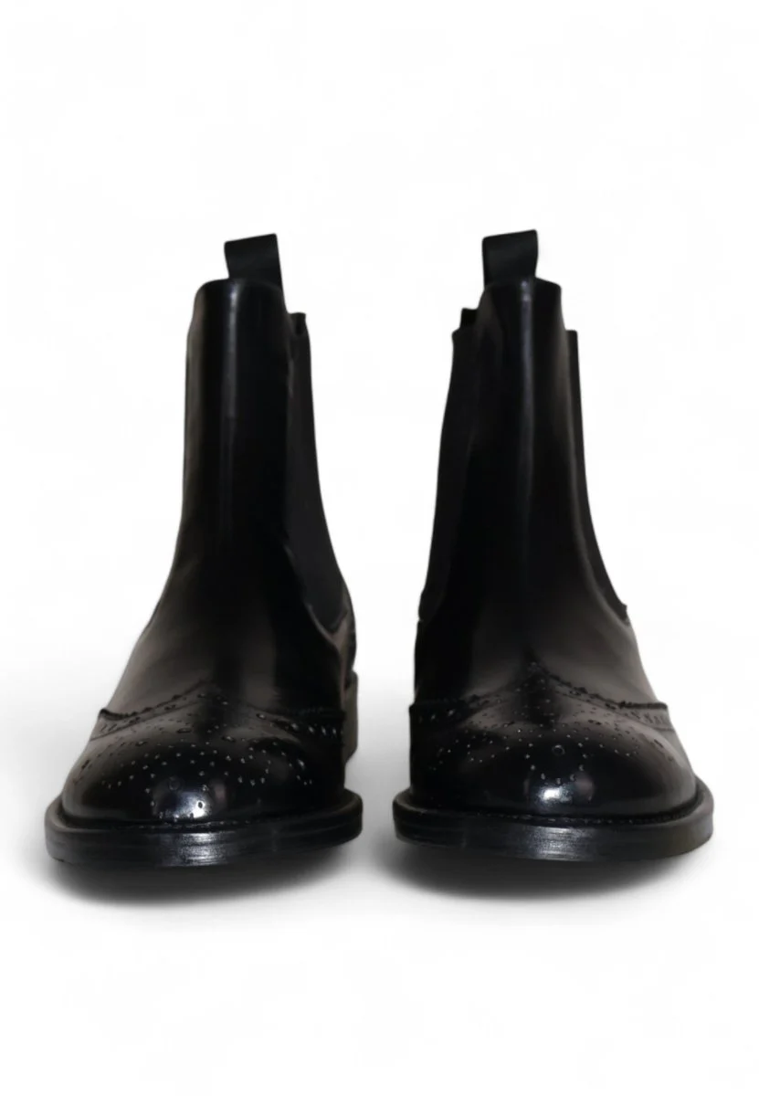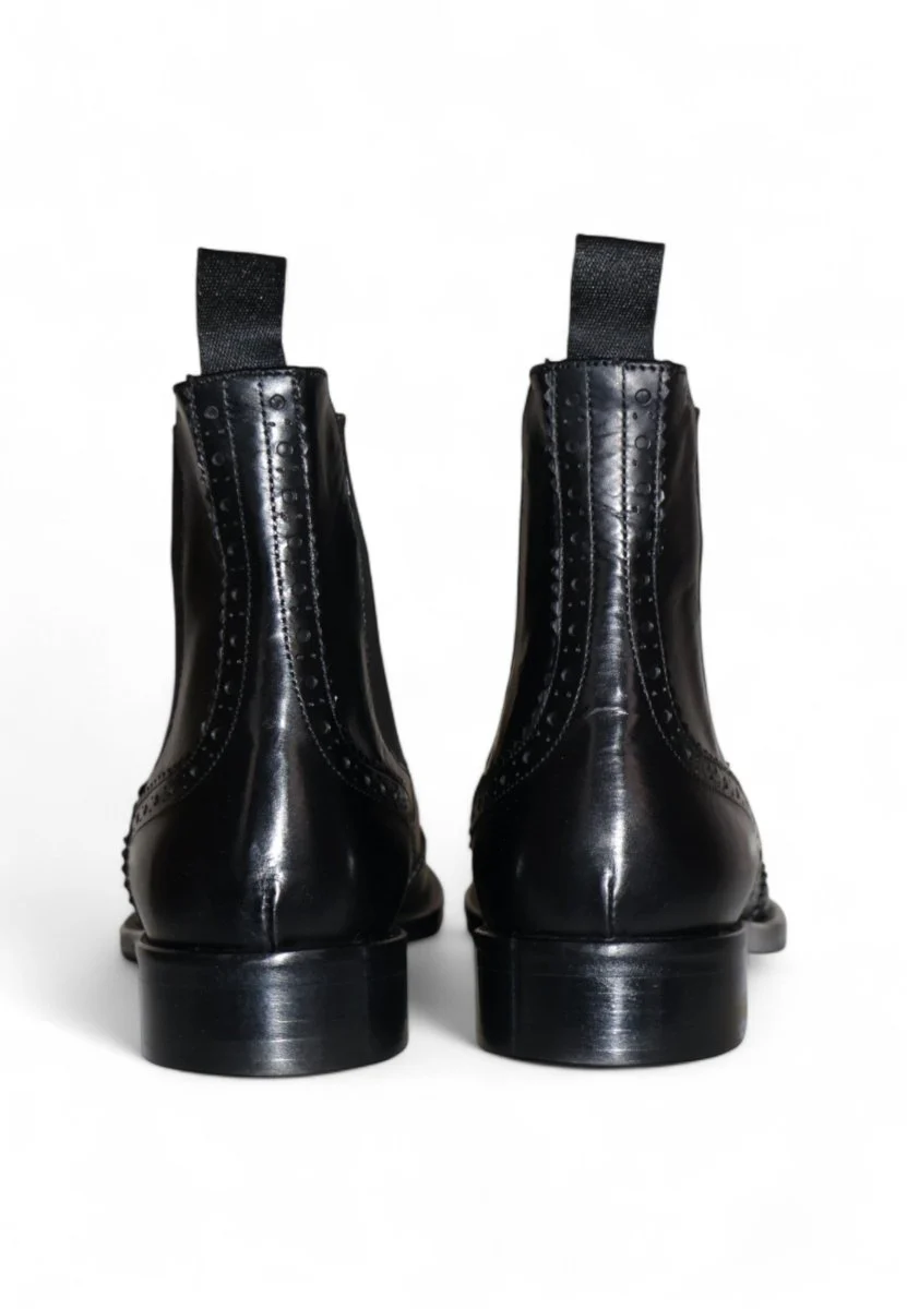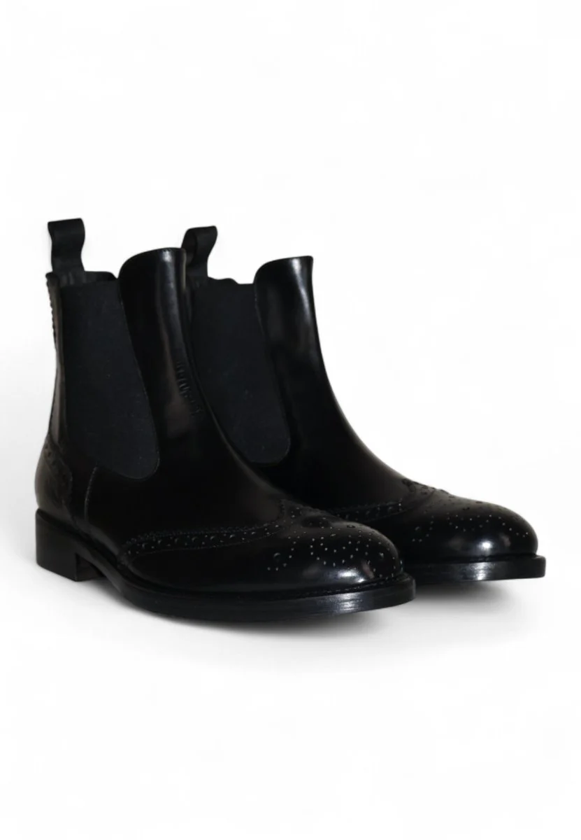 Stivaletto elegante in pelle nera con raffinata lavorazione a coda di rondine. Il design con elastico laterale garantisce praticità e comfort, mentre il fondo in cuoio con inserto antiscivolo assicura stabilità e durata. Un modello dal gusto classico e distintivo, perfetto per chi cerca uno stile ricercato e senza tempo.
