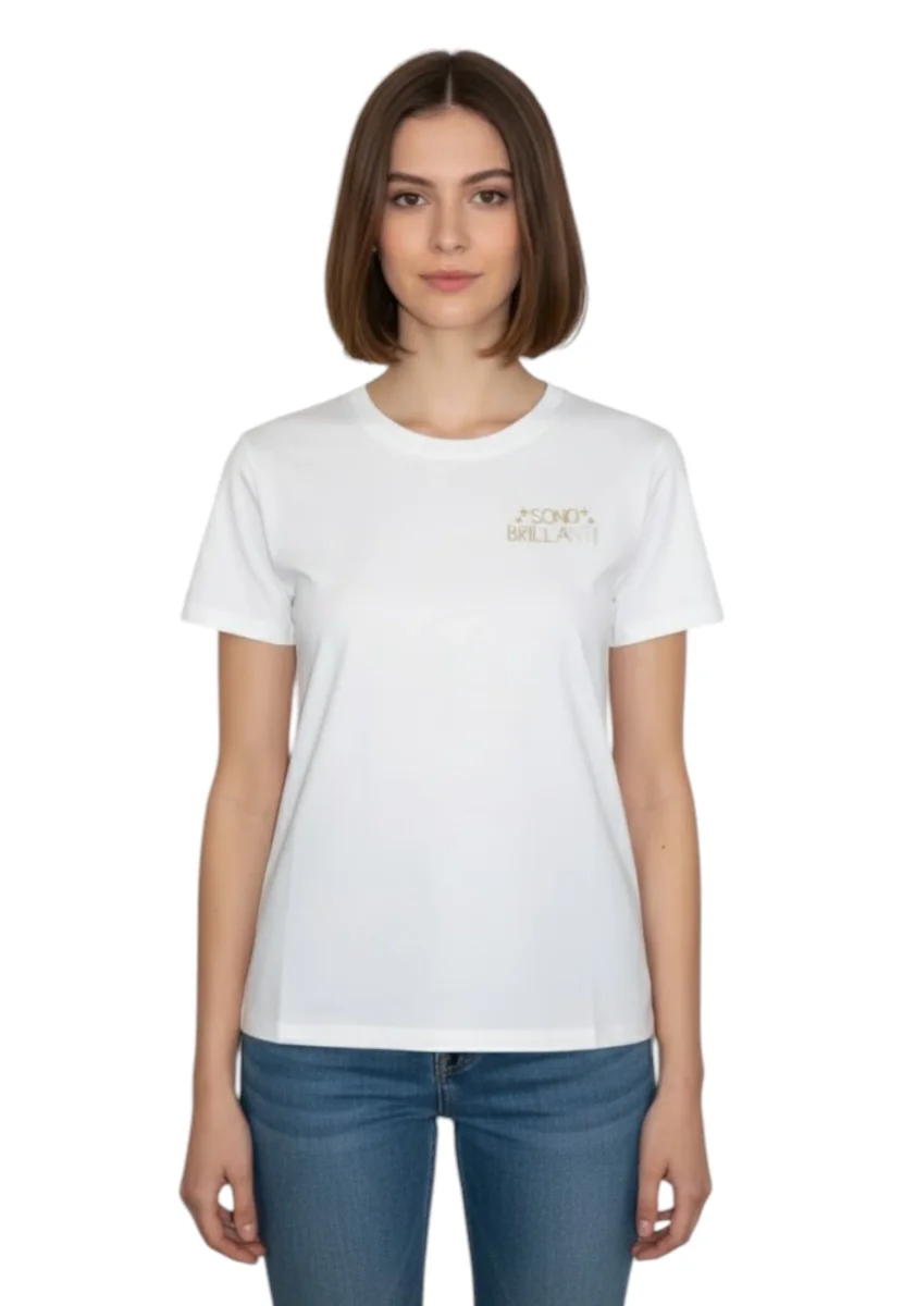 Realizzata in morbido 100% cotone, questa t-shirt offre il massimo comfort per tutto il giorno. Il suo design essenziale è elevato da un messaggio di brillantezza stampato, che aggiunge un tocco distintivo e vivace. Il taglio classico si adatta a qualunque silhouette, rendendola una scelta versatile per abbinamenti con jeans, pantaloni o gonne.