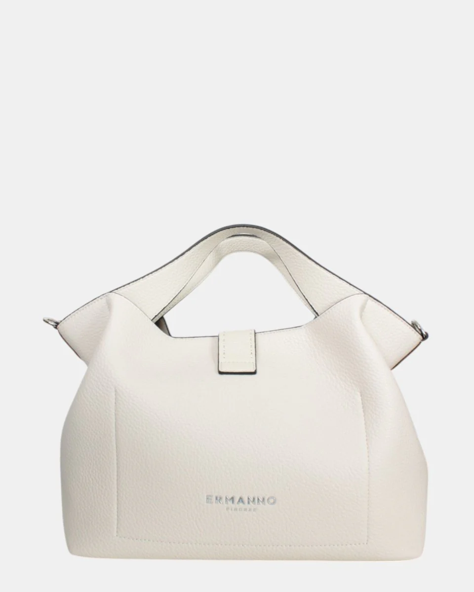 La borsa di Ermanno Scervino presenta chiusura con fibietta logata con magnete, due tasche interne, con interno rivestito in effetto camoscio