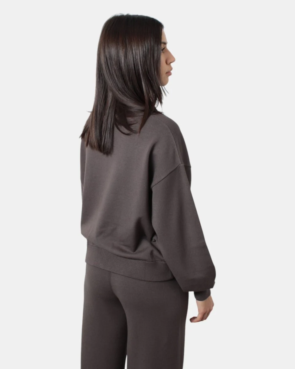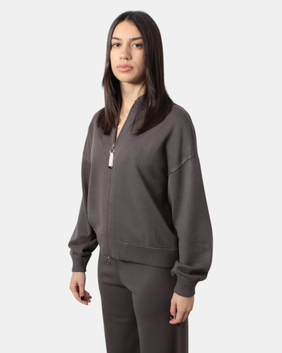 La felpa con zip di Max Mara presenta collo, fondo e polsi a costine, fantasia monocolore, dalla mano morbida dovuta alla sua composizione in 72% viscosa e 28% poliestere. Si consiglia lavaggio a mano. La modella è alta 1,68 m e indossa una S