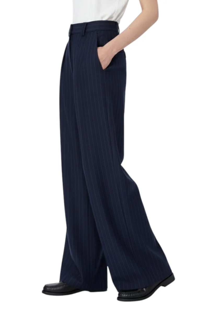 Ispirazione sartoriale e comfort contemporaneo si fondono nei pantaloni da donna MM Max Mara, realizzati in morbido jersey di viscosa con motivo gessato a contrasto. Il design, dalla linea dritta e pulita, richiama l’eleganza maschile reinterpretata in chiave femminile, con dettagli curati come le doppie pinces laterali sul davanti e le tasche a filetto sul retro. Il cintone con passanti in vita aggiunge struttura e versatilità, mentre la chiusura con zip nascosta garantisce una finitura discreta e raffinata.
