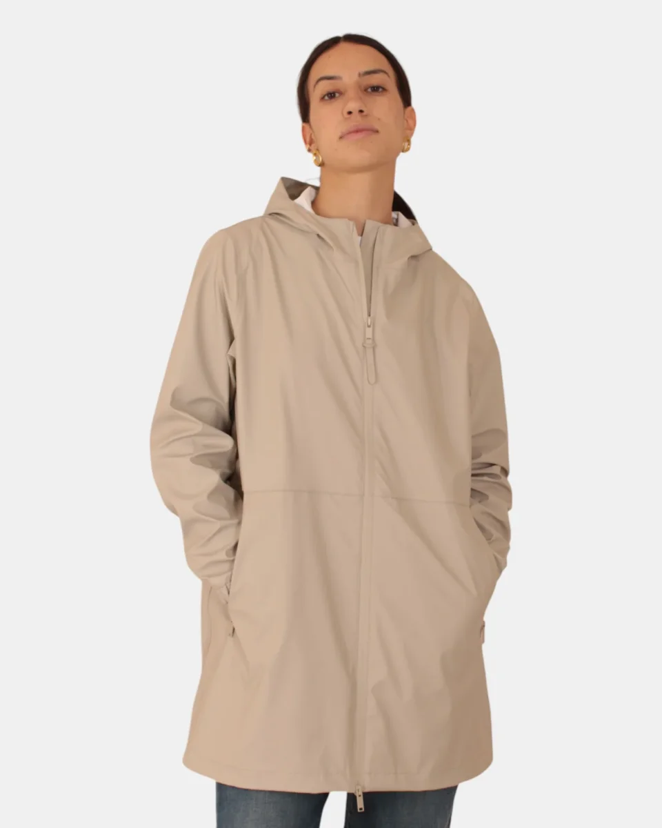 la giacca di Tantä rainwear presenta chiusura con zip doppio cursore e 2 tasche con chiusura con zip invisible, composizione in 100%poliuretano. 100% impermeabile. Si consiglia lavaggio a massimo 30 gradi. La modella è alta 1,68 m e indossa una 40