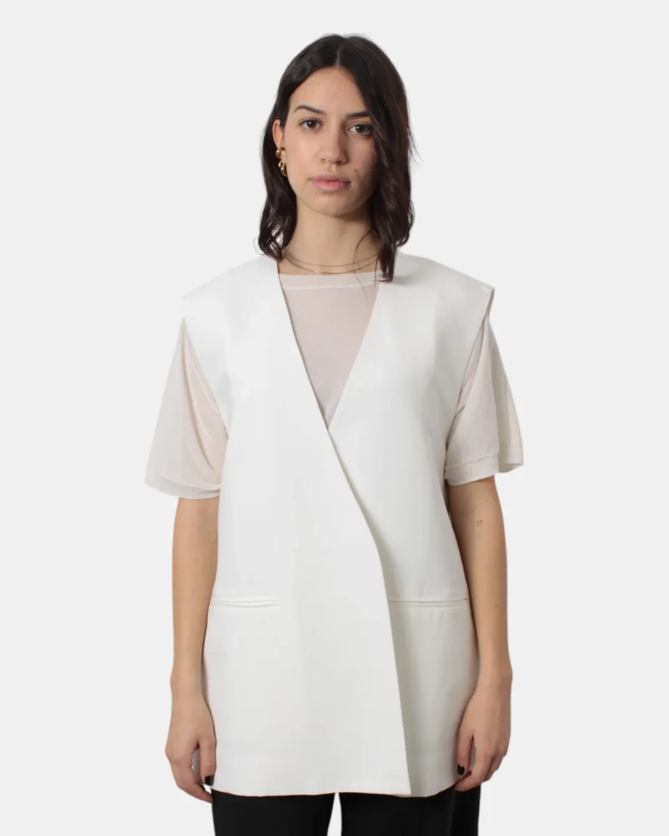 Il gilet di Meimeij presenta due finte taschine a filetto sul fronte, fantasia monocolore, vestibilità leggermente ampia, dalla mano soffice e fresca dovuta alla sua composizione in 67% viscosa e 33% lino. Si consiglia il lavaggio a massimo 30 gradi. La modella è alta 1,68 m e indossa una 38