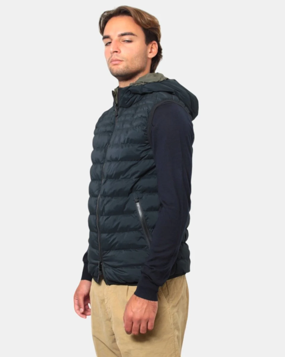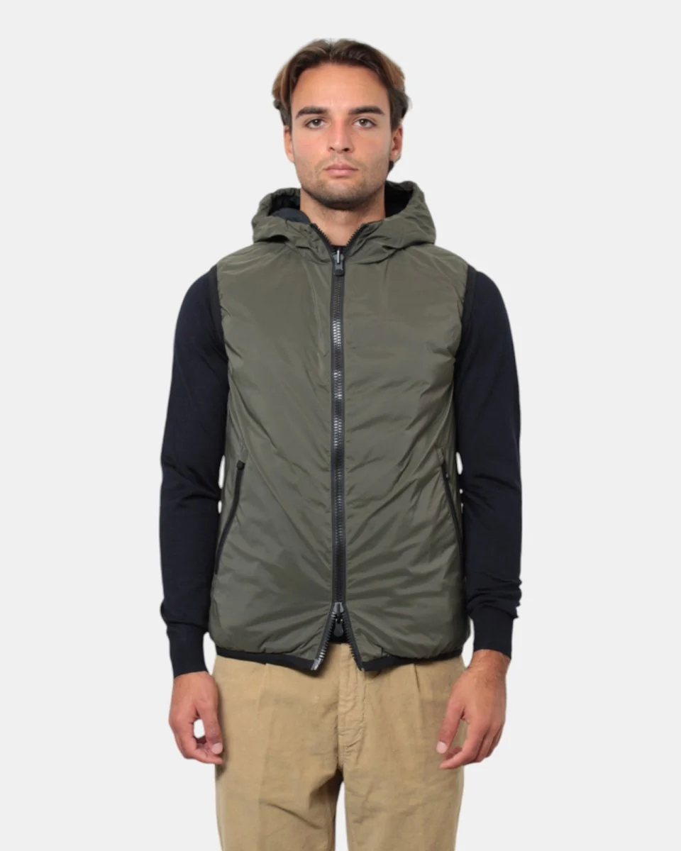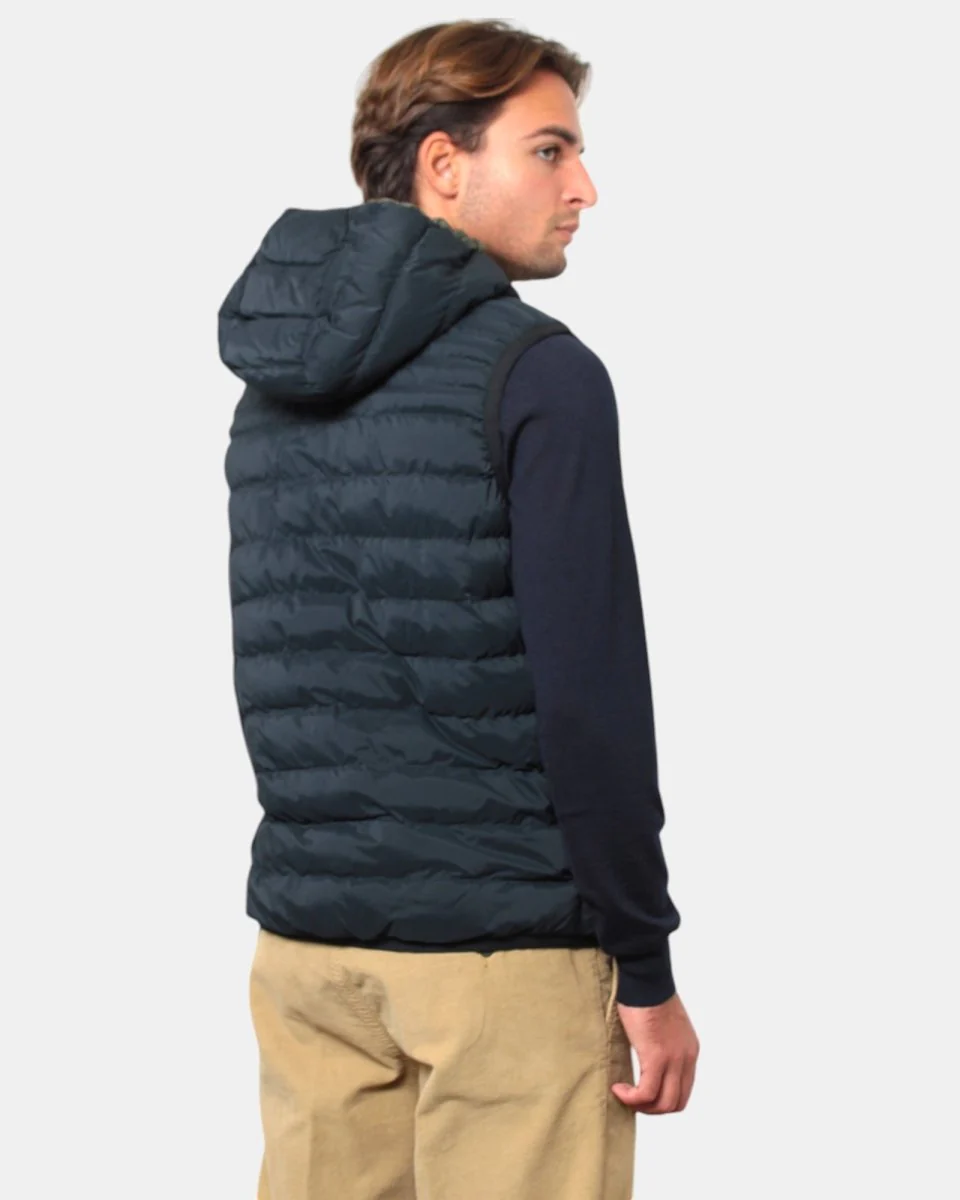 Modello: Gilet con cappuccio e design double face, offrendo versatilità e due opzioni di stile in un unico capo.