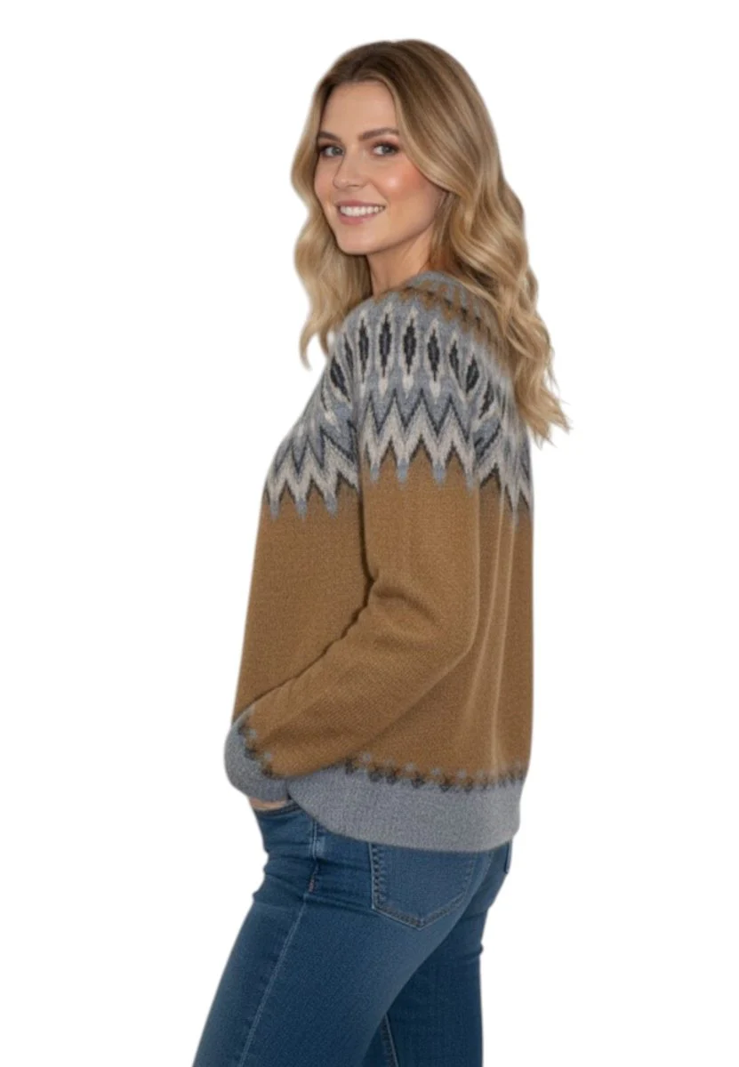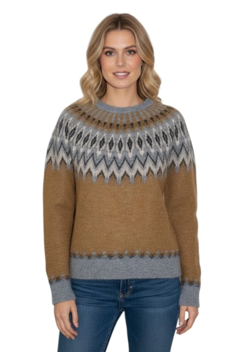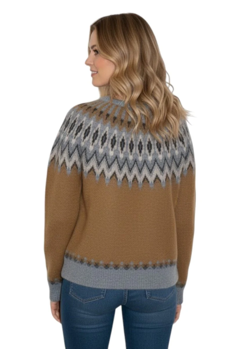 Realizzato in una preziosa miscela di alpaca (45%), poliammide (35%) e lana (20%), questo maglione unisce calore, leggerezza e morbidezza in un design raffinato e senza tempo. Il motivo jacquard dona un tocco grafico e artigianale che valorizza ogni outfit con personalità.