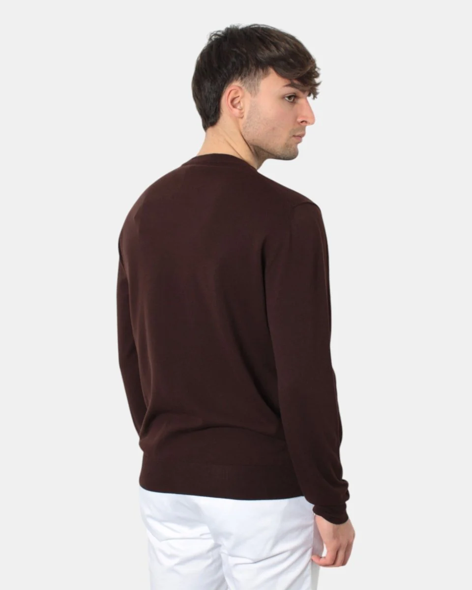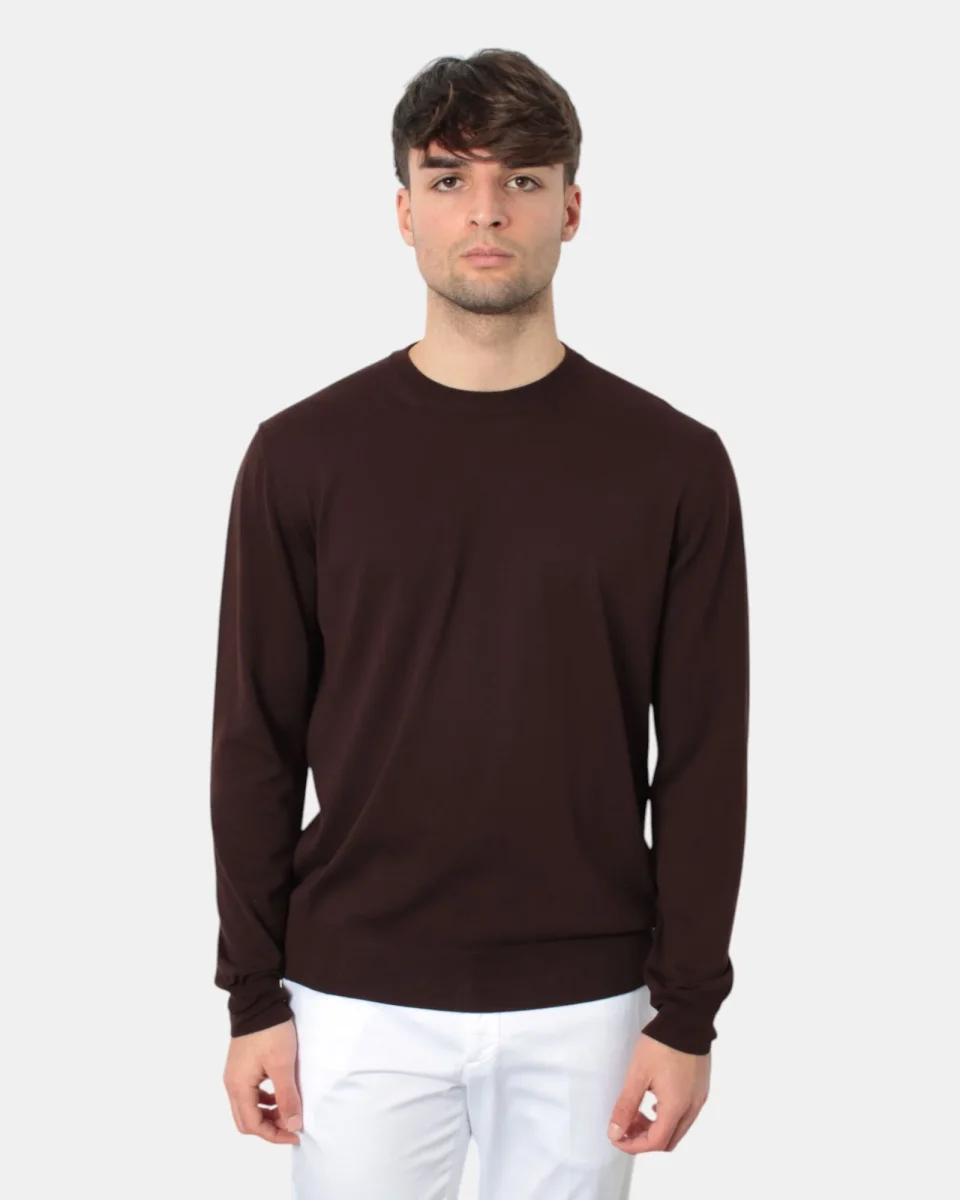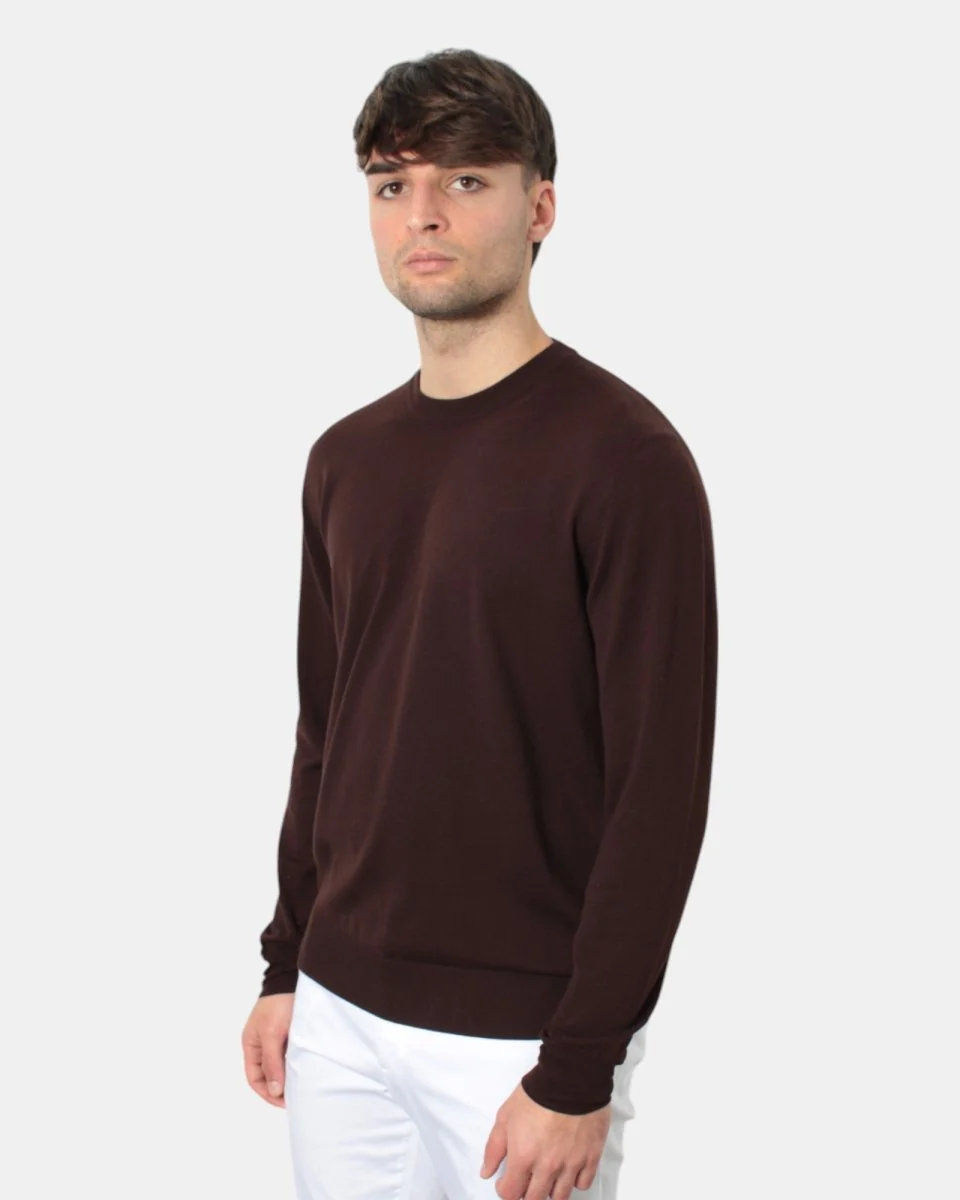La maglia a girocollo a maniche lunghe di Altea presenta maniche, fondo e collo a costine, fantasia monocolore, dalla mano fresca e morbida dovuta alla sua composizione in 100% cotone. Si consiglia lavaggio a mano. Il modello è alto 1,78 m e indossa una L