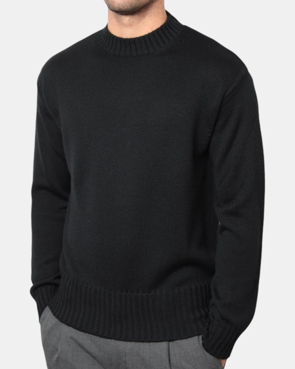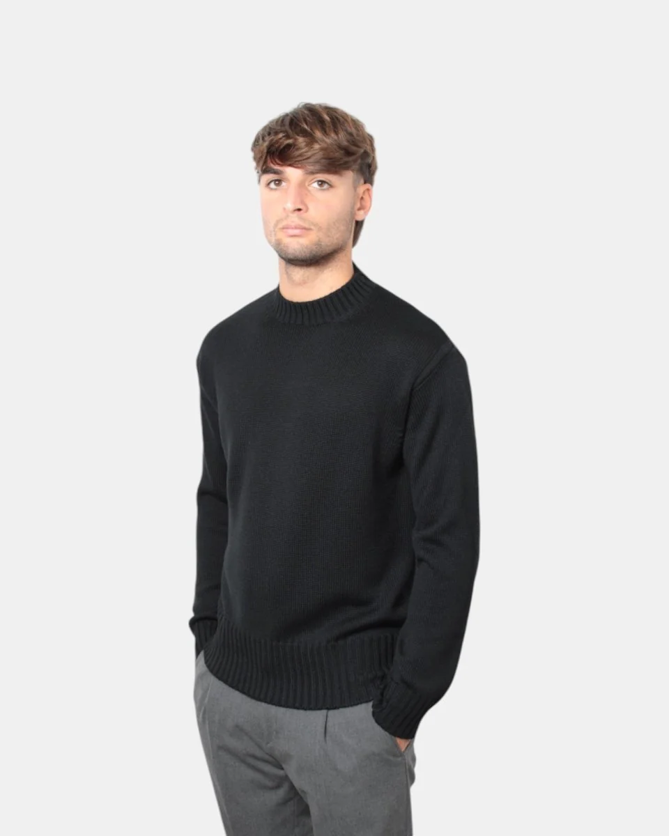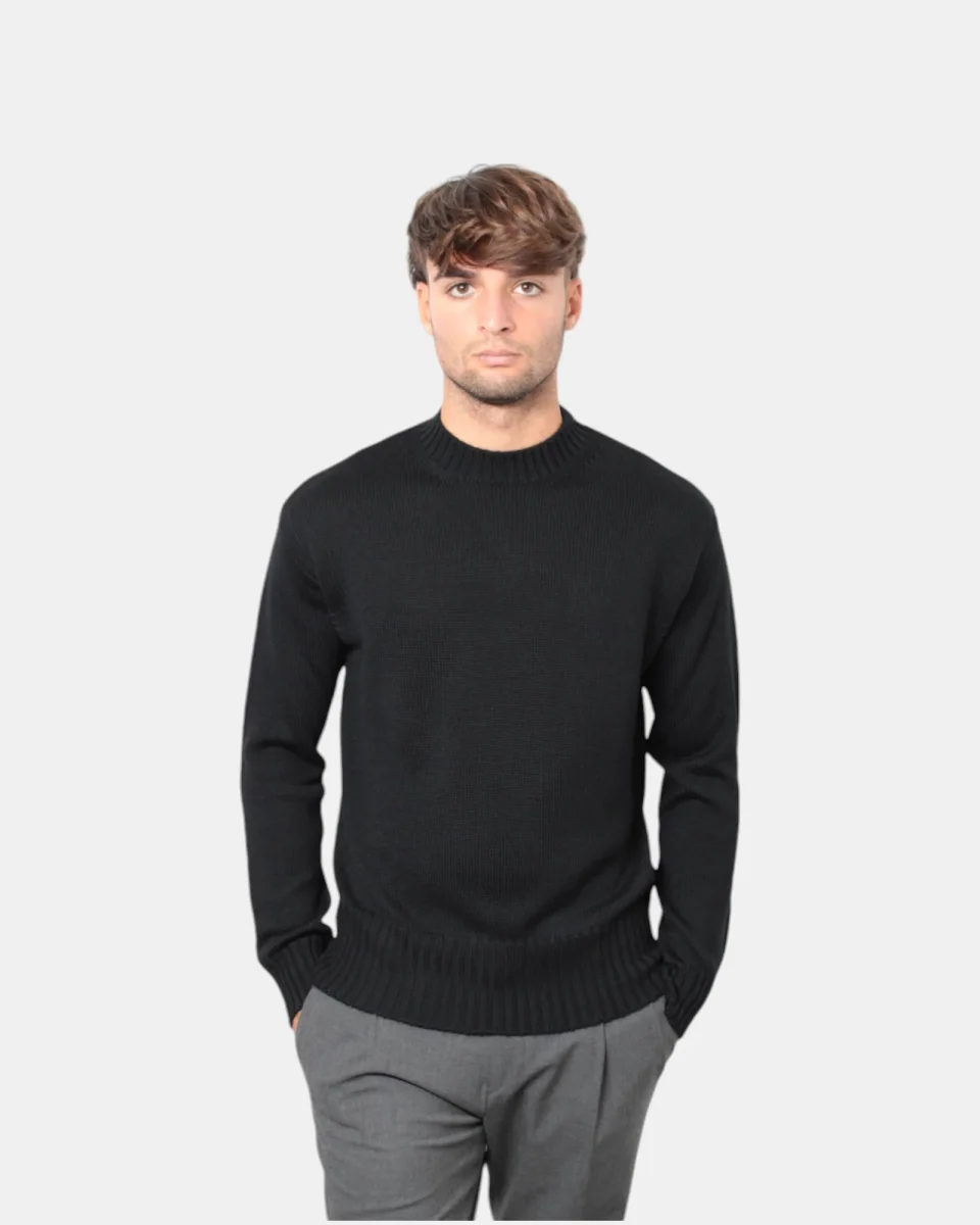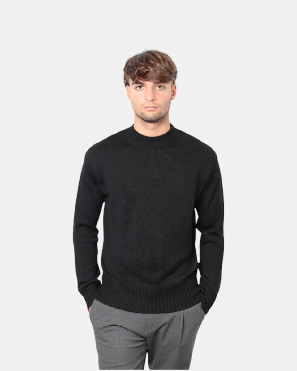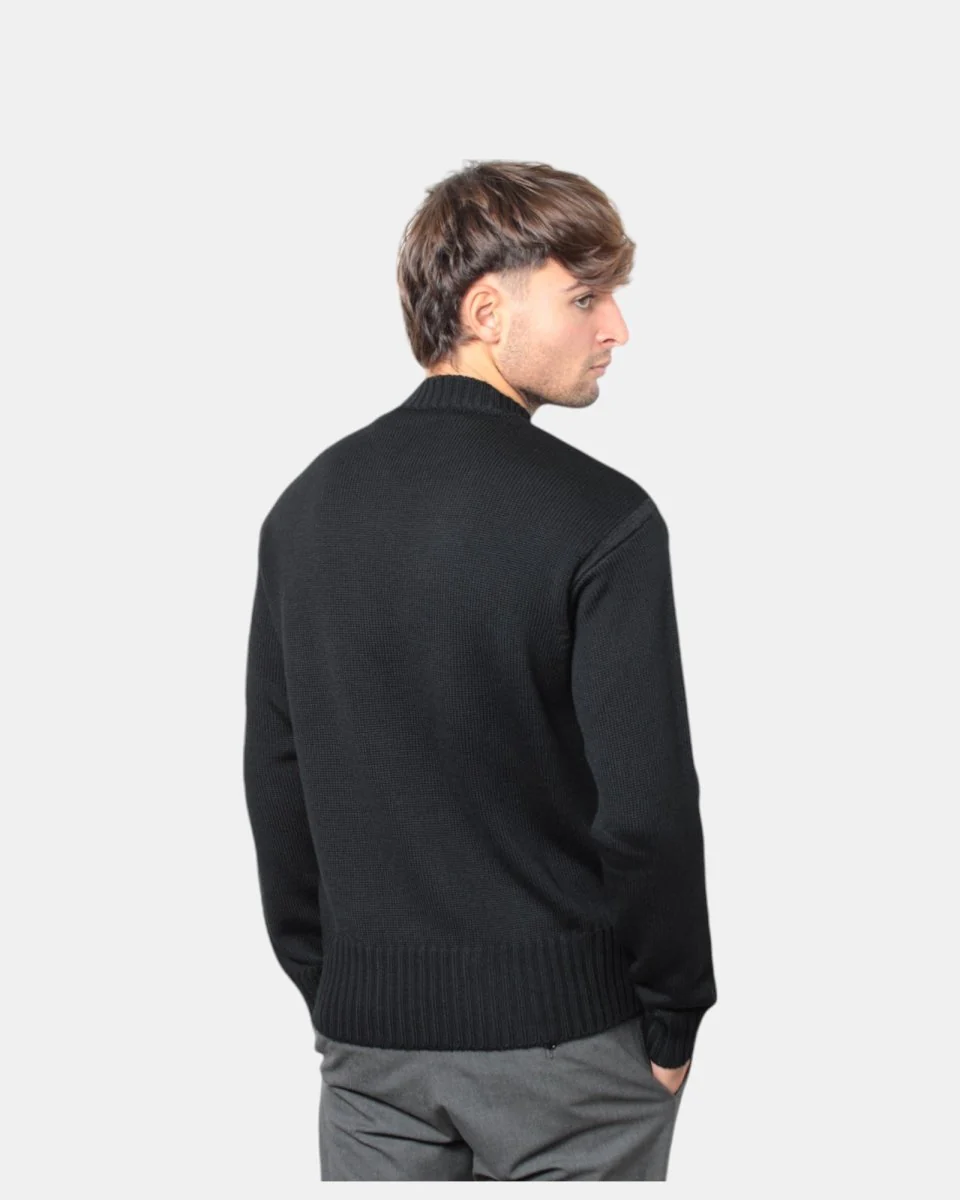 La maglia a girocollo di Daniele Fiesoli dalla lavorazione calata in finezza cinque presenta la sua composizione in 50% lana merino e 50% acrilico garantendo calore e lunga durata.