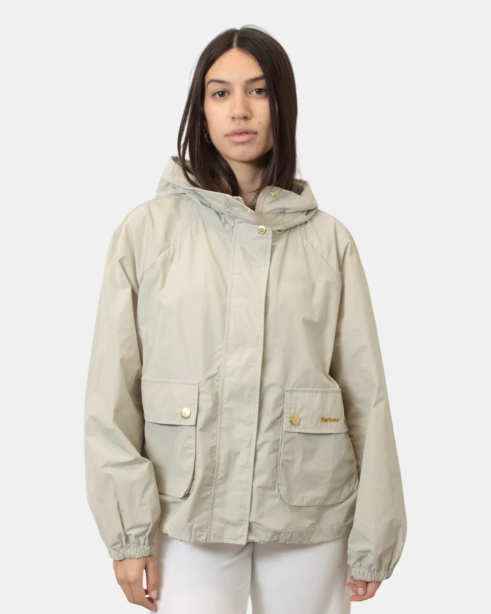 La giacca di Barbour con cappuccio presenta chiusura con zip in ottone e bottoni a pressione, due tasche con bottone a toppa, elastico sulle maniche e sul fondo, dalla mano fresca dovuta alla sua composizione in 100% poliuestere. Si consiglia lavaggio a massimo 30 gradi. La modella è alta 1,68 m e indossa una 10