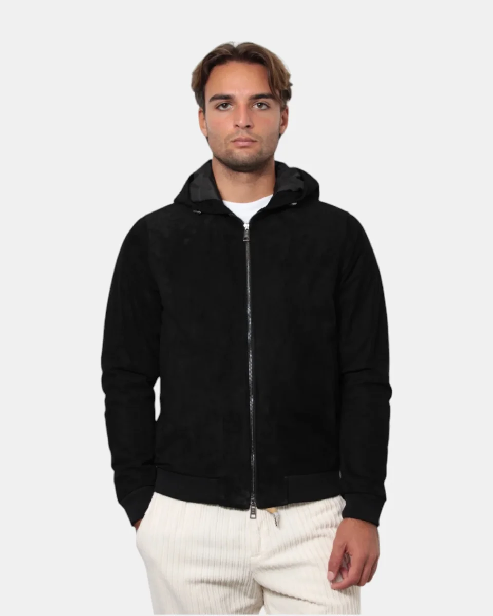 Dettaglio: Realizzata in pelle di nabuk cerato per una texture morbida e sofisticata. Dotata di cappuccio per un tocco di praticità e versatilità.