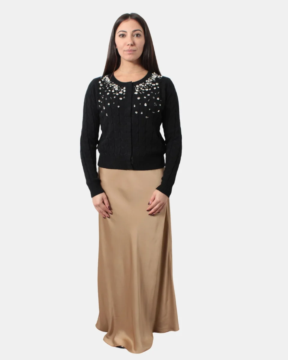 La gonna lunga in raso di Daniele Fiesoli modello trapezio è per il 100% viscosa. Si consiglia lavaggio a mano o a secco con stiratura a bassa temperatura. La modella è alta 1,67 m e indossa una S