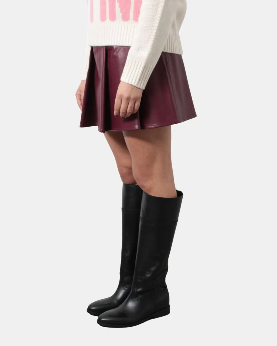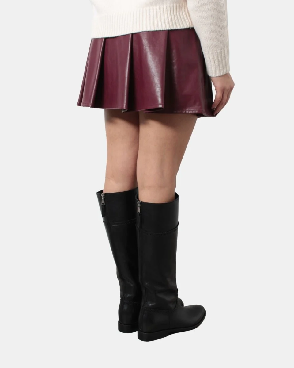 La minigonna a pieghe in ecopelle di Jijil, presenta chiusura laterale con zip, ed è 100% viscosa con spalmatura poliuretanica. Si consiglia lavaggio a mano. La modella è alta 1,67 m e indossa una 40