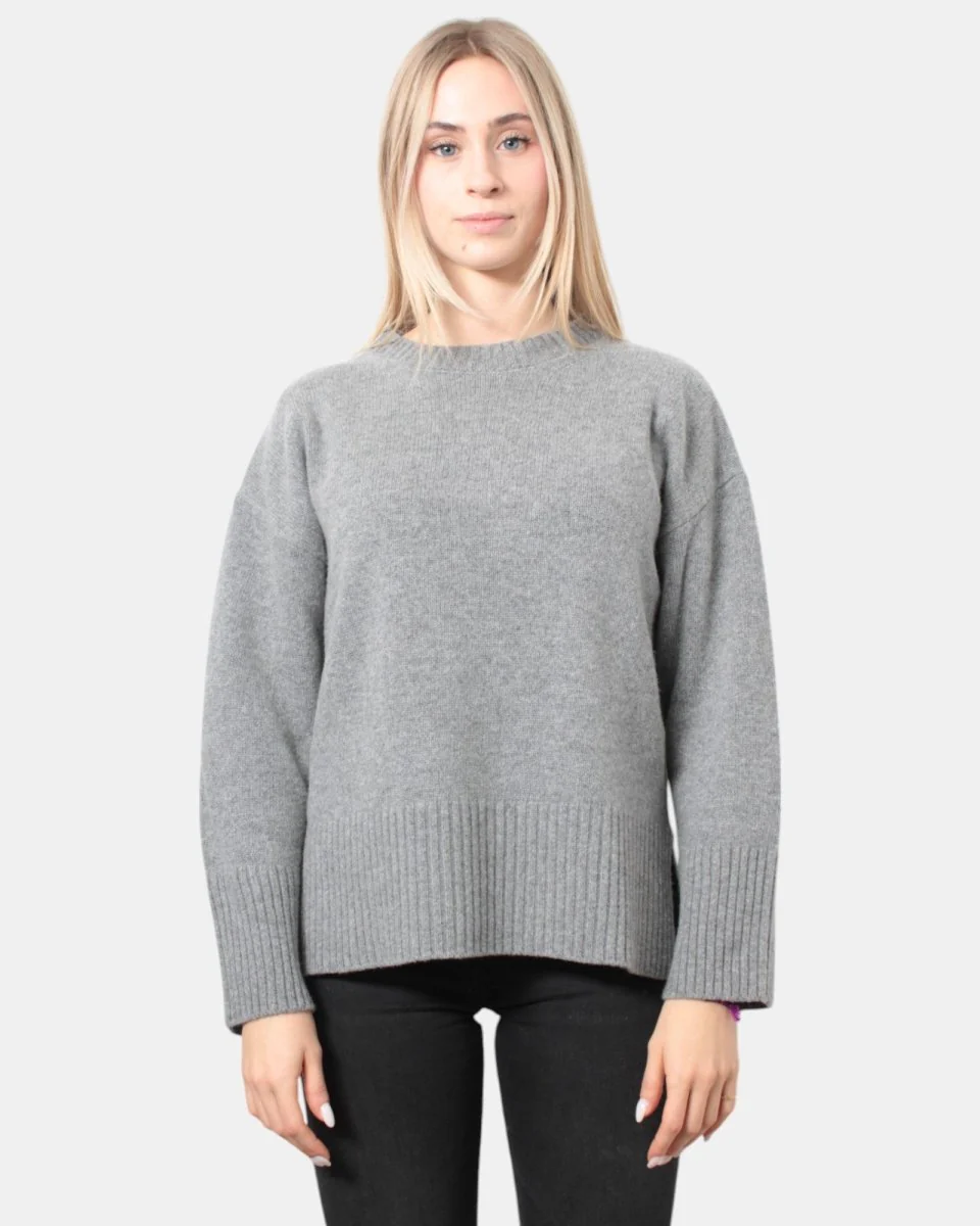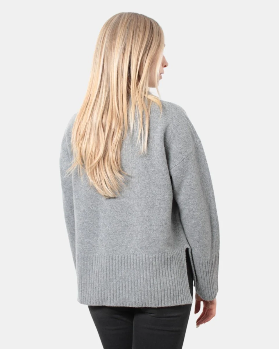 La maglia a girocollo di Hekla&Co presenta collo, fondo e polsi a coste, due spacchetti laterali con fondo posteriore più lungo, vestibilità regolare, dalla mano morbida e calda dovuta alla sua composizione in 48% lana, 30% viscosa, 15% poliammide e 7% cashmere. Si consiglia il lavaggio a secco. La modella è alta 1,67 m e indossa una S