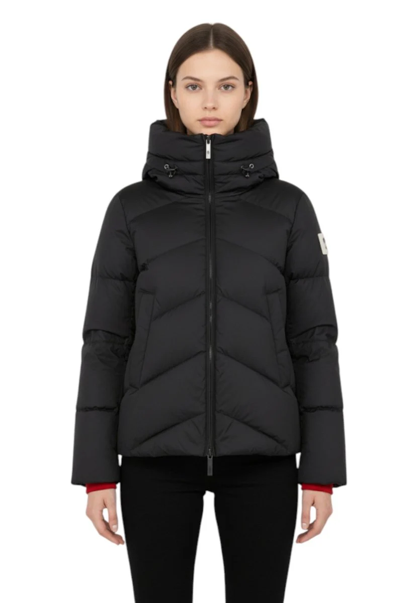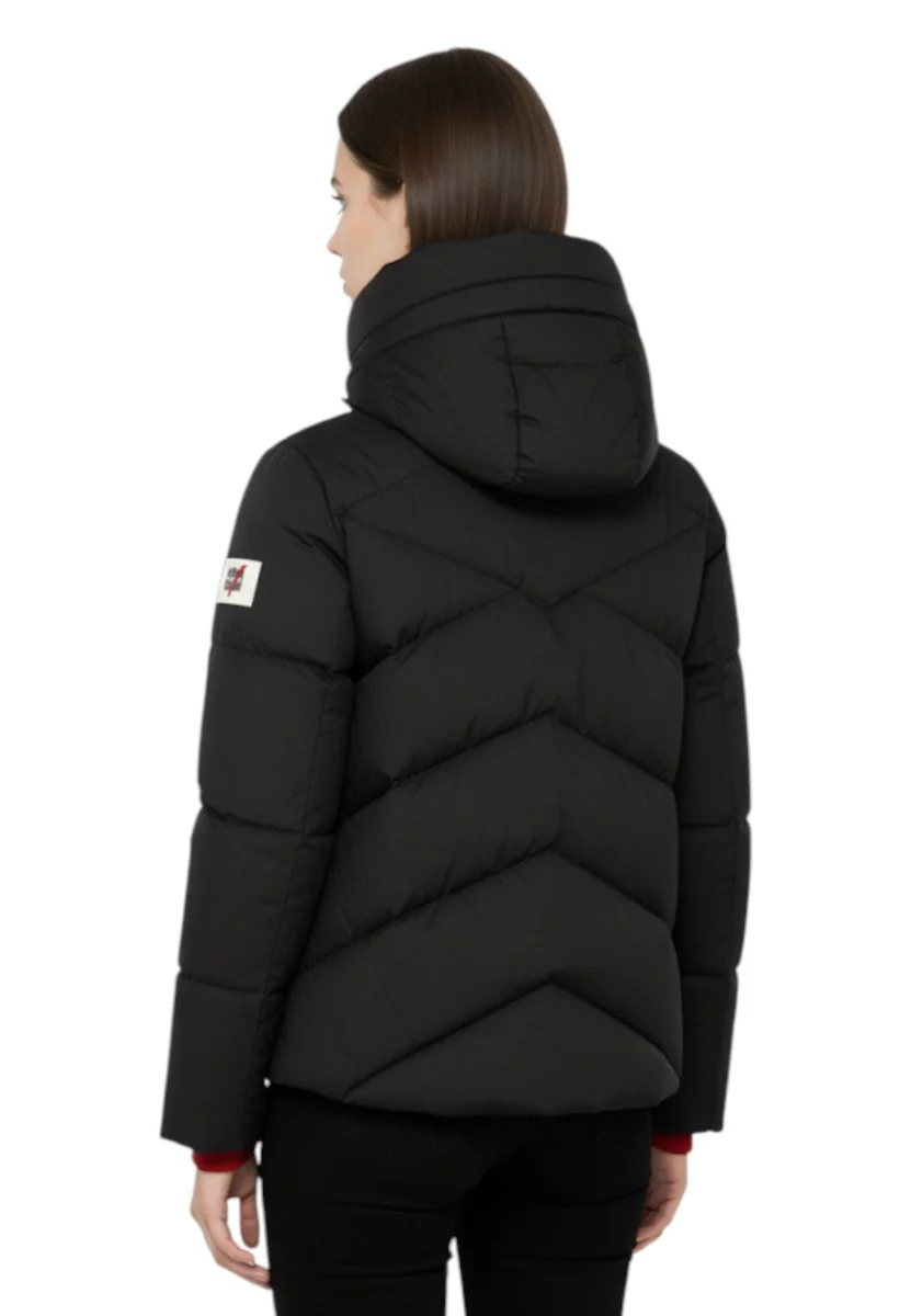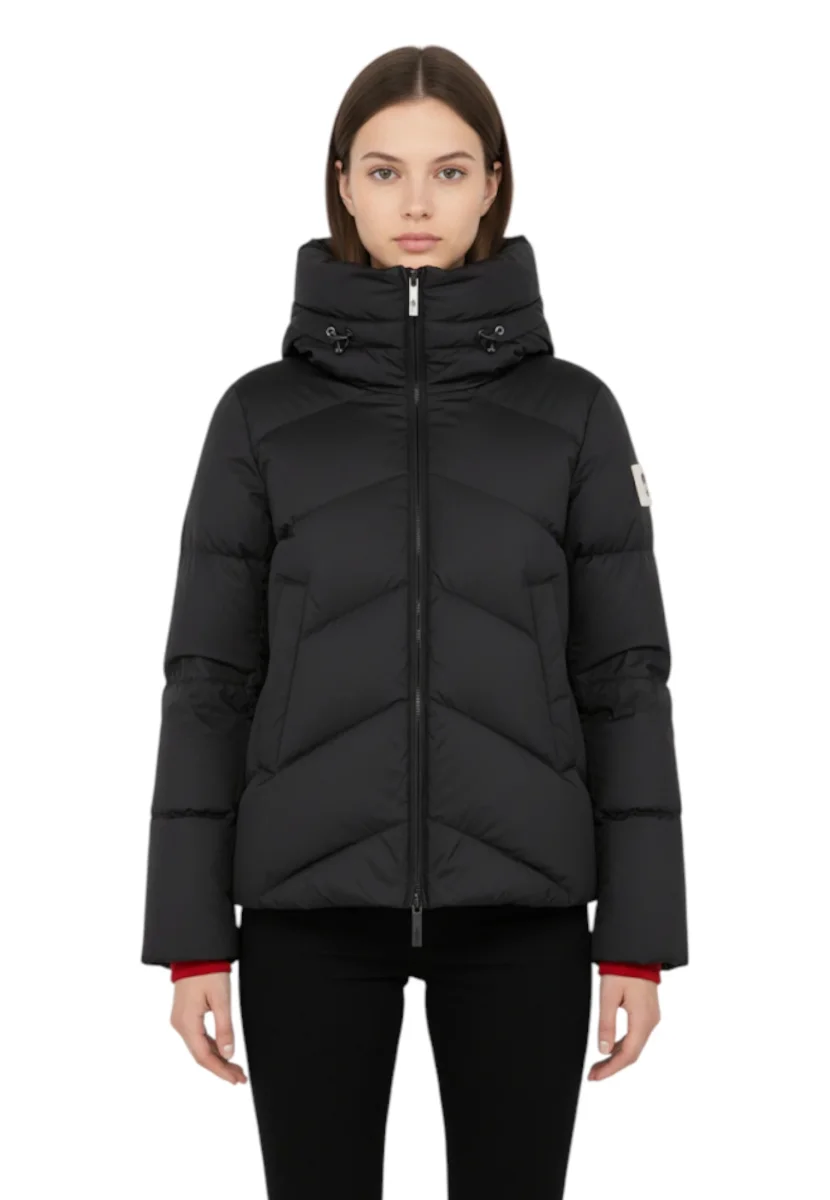 Il dettaglio distintivo è l’ampio collo alto, trasformabile in cappuccio grazie alla coulisse regolabile: una soluzione perfetta per affrontare il freddo con protezione e versatilità. L’imbottitura in 90% piuma d’anatra assicura calore senza appesantire, ideale per la stagione invernale.