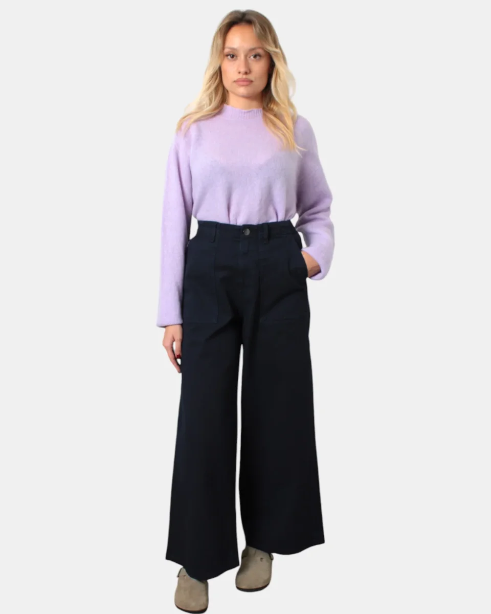 Il pantalone di Jijil presenta chiusura centrale con zip e bottone, passsanti ed elastico sul retro, due tasche laterali sovrapposte, con vestibilità ampia. La sua composizione è per il 98% cotone e 2% elastan. Si consiglia lavaggio a mano o a secco e stiratura a bassa temperatura. La modella è alta 1,67 m e indossa una 26