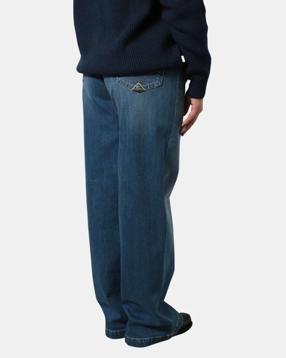 Il jeans di Roy Rogers modello MARTA cinque tasche presenta bottone dorato con zip, vestibilità a vita medio/alta e gamba a palazzo, sul retro presenta il caratteristico logo sulla tasca destra, dal tessuto morbido e piacevole dovuto alla sua composizione per il 98% in cotone e 2% elastan. La modella è alta 1,70 m e indossa una 25