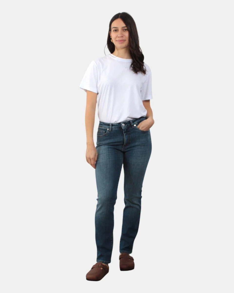 Il jeans di Nine in the Morning presenta chiusura con zip e bottone, tasche frontali e sul retro con logo brand in contrasto, vestibilità slim. Si consiglia lavaggio a mano. La modella è alta 1,68 m e indossa una 27