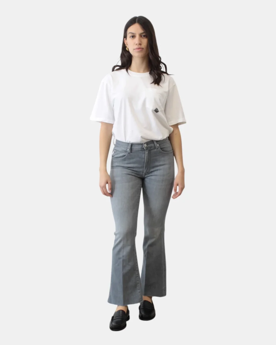 Il jeans di People presenta chiusura con zip e bottone, due tasche frontali, due sul retro a toppa, dalla mano fresca dovuta alla sua composizione in 92% cotone, 6% elastomultiestere e 2% elastan. Si consiglia lavaggio a mano. La modella è alta 1,68 m e indossa una 27