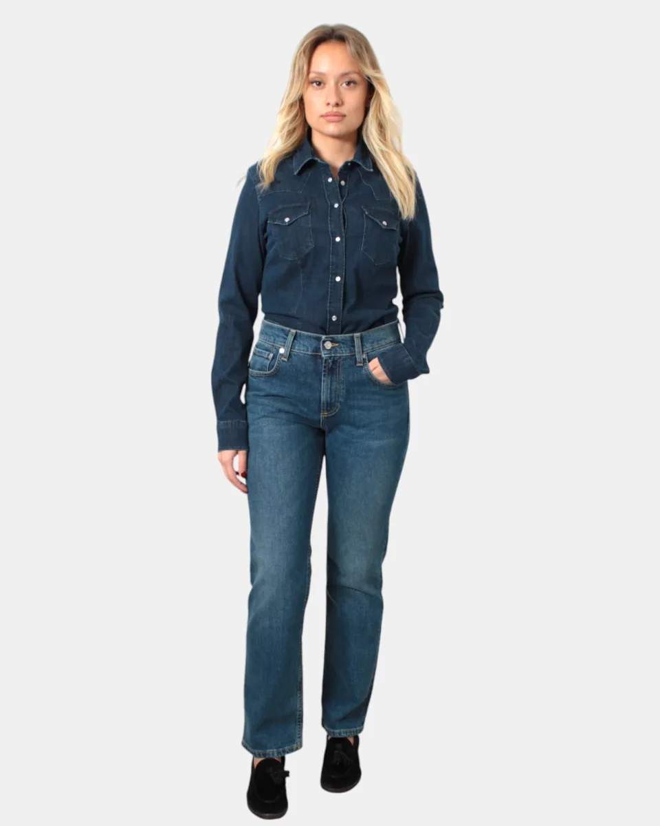 Il jeans di Roy Rogers modello SOFIA cinque tasche presenta bottone argentato con zip, vestibilità regolare con vita medio/alta, gamba dritta, sul retro presenta il caratteristico logo sulla tasca destra, dal tessuto morbido e piacevole dovuto alla sua composizione per il 99% cotone e 1% elastan. Si consiglia lavaggio medio. La modella è alta 1,70 m e indossa una 25