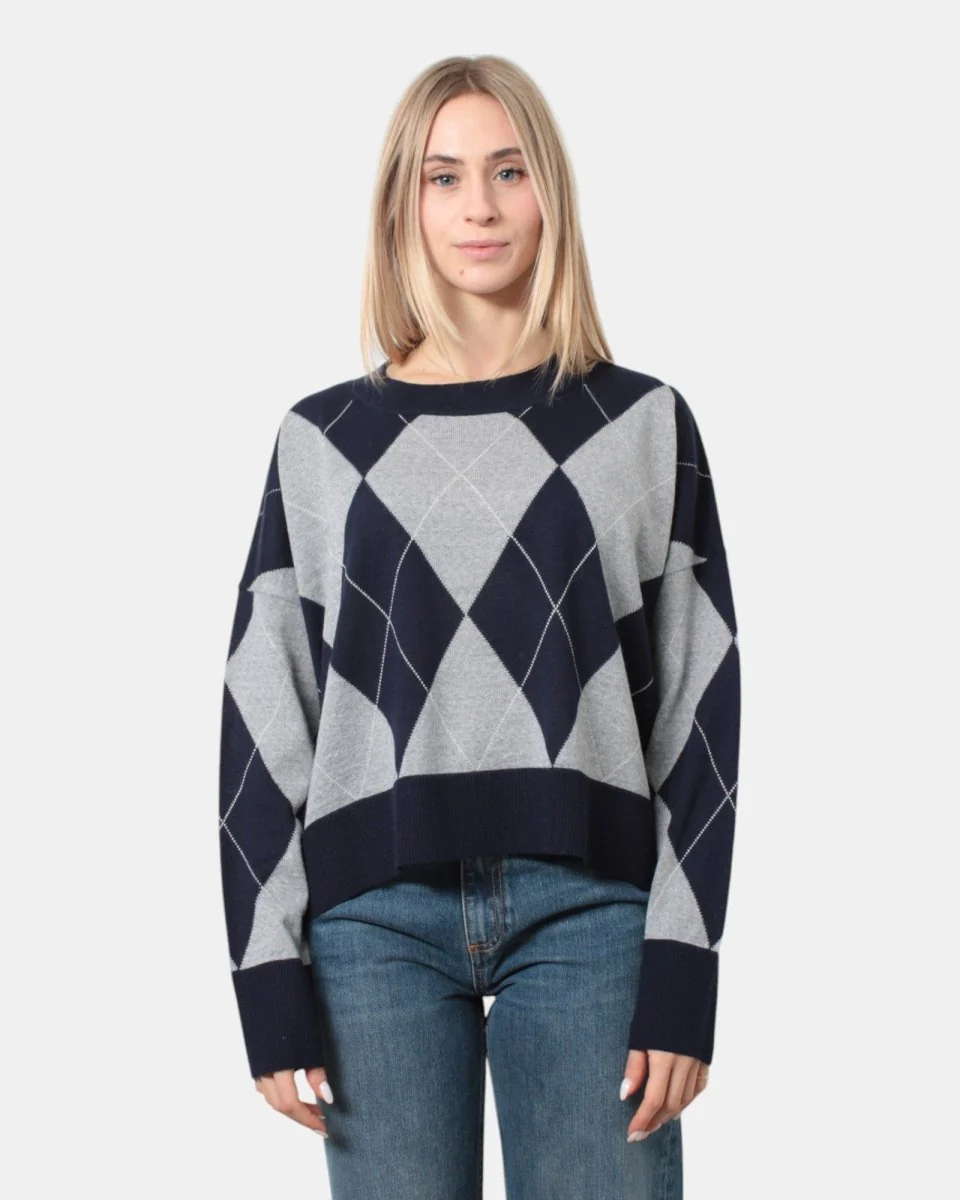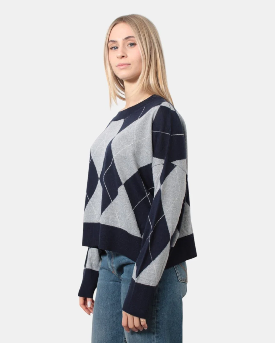 La maglia a girocollo di Jei-o presenta fantasia a rombi, collo, fondo e polsi a costine, con giro sceso. La sua composizione è per il 50% lana e 50% acrilica. Si consiglia lavaggio a mano. La modella è alta 1,67 m e indossa una M