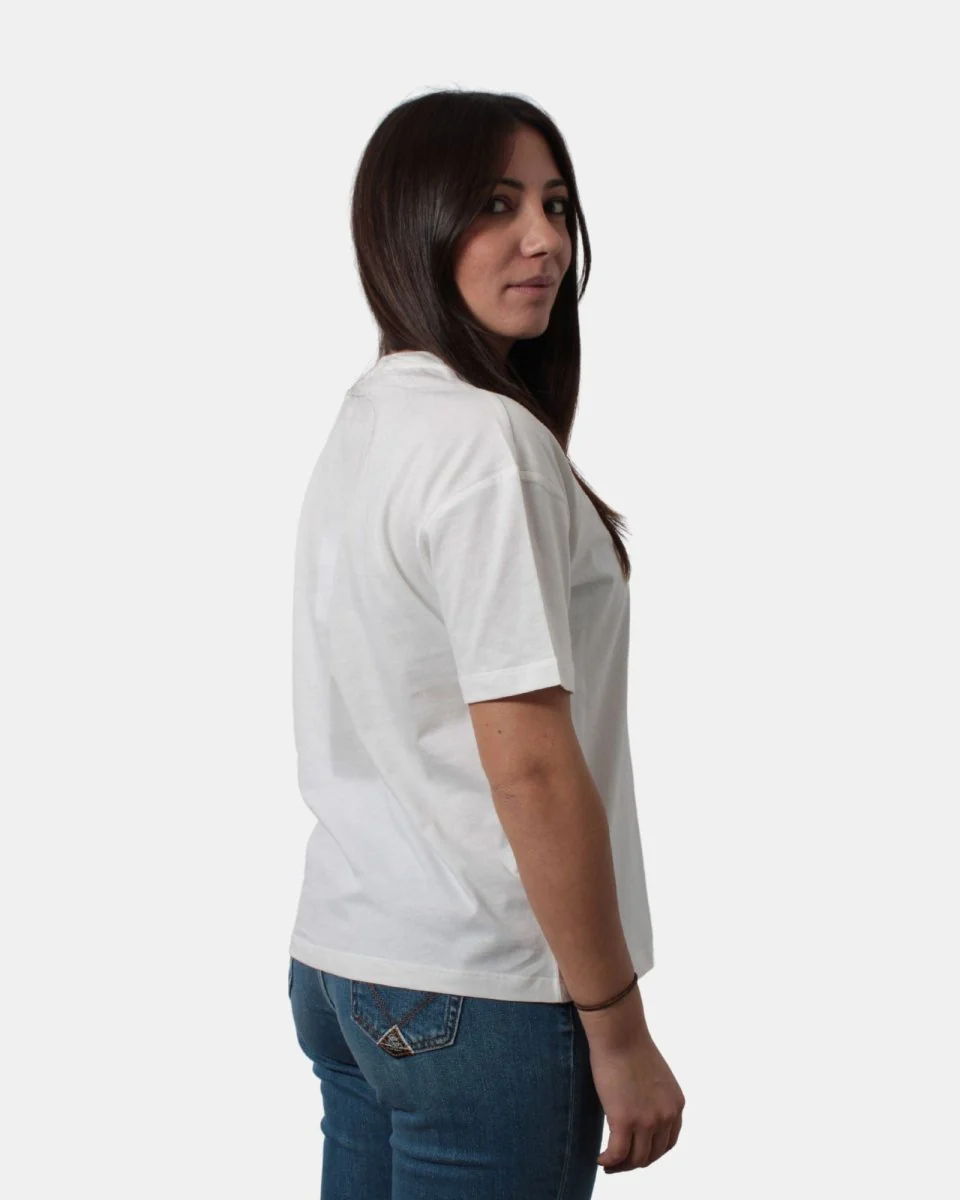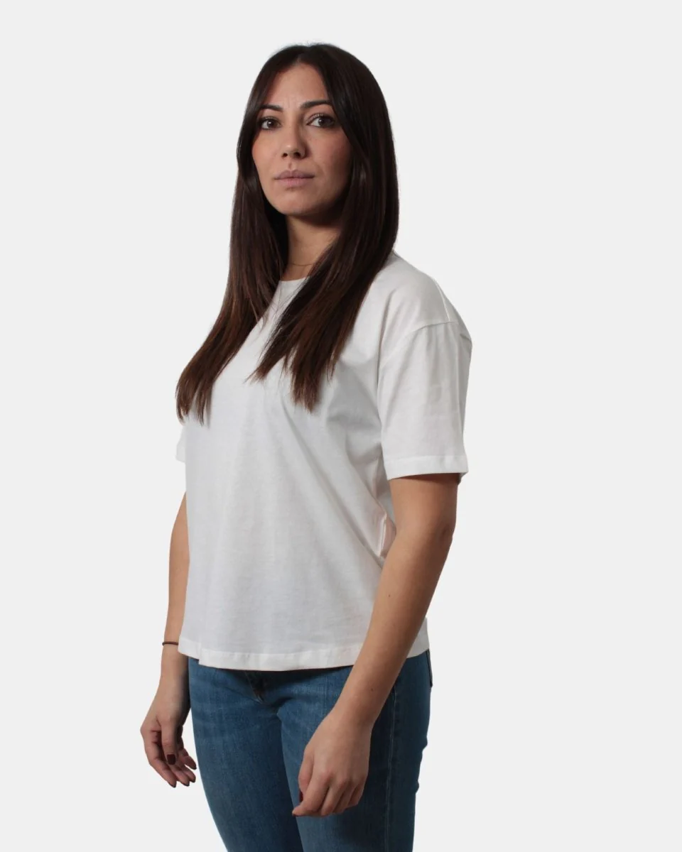 La T-shirt di Jijil presenta fantasia monocolore a maniche corte, dalla mano soffice dovuta alla sua composizione in 100% cotone ,la modella è alta 1,67 m e indossa una 40