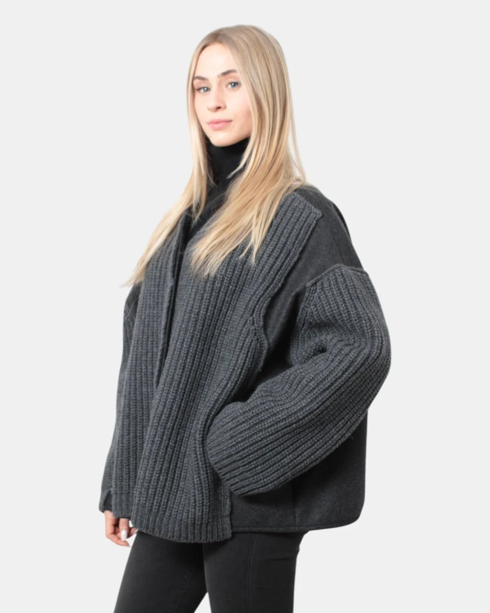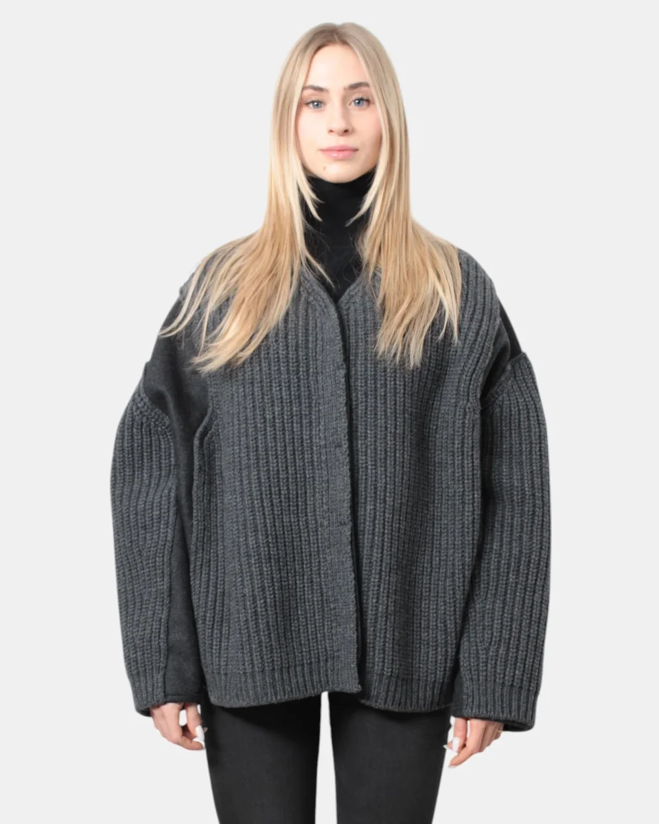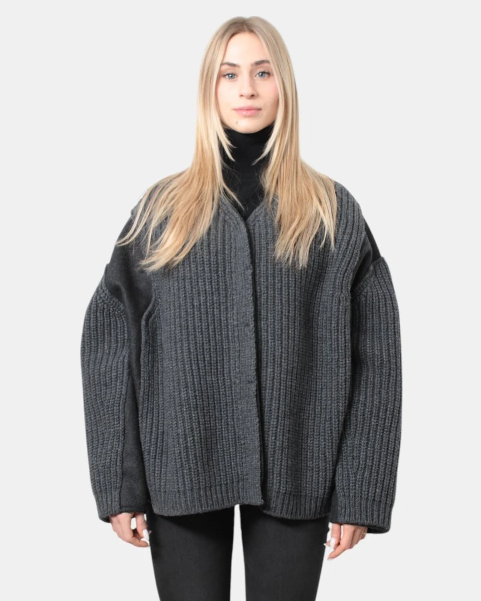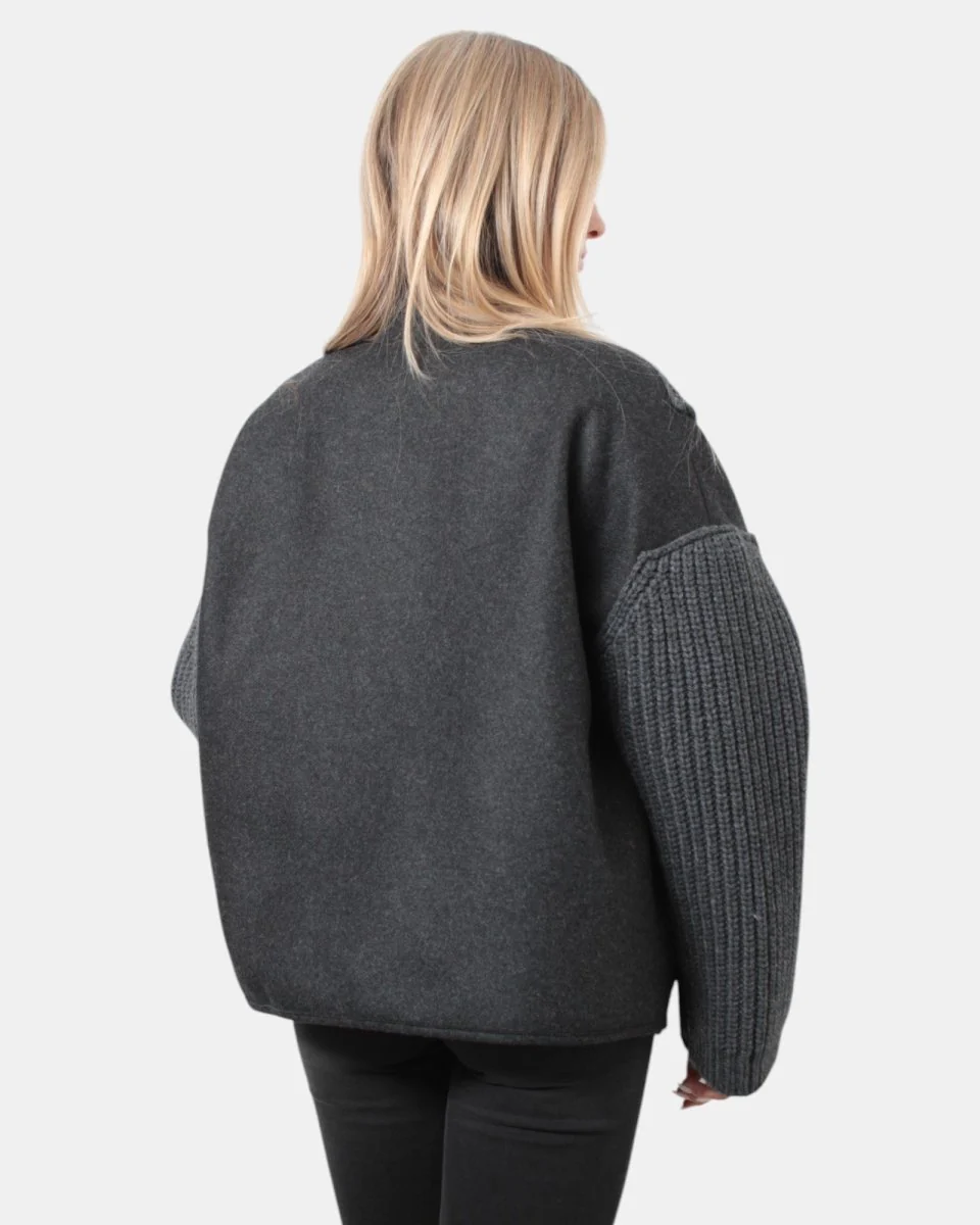 Il giaccone di Jucca presenta giro sceso, tessuto in contrasto, con chiusura a quattro bottoni, polsi e fondo a costine, dal taglio morbido e caldo dovuto alla sua composizione in 75% lana vergine, 22% poliammide e 3% cashmere. Si consiglia il lavaggio in lavanderie specializzate . La modella è alta 1,67 m e indossa una 40