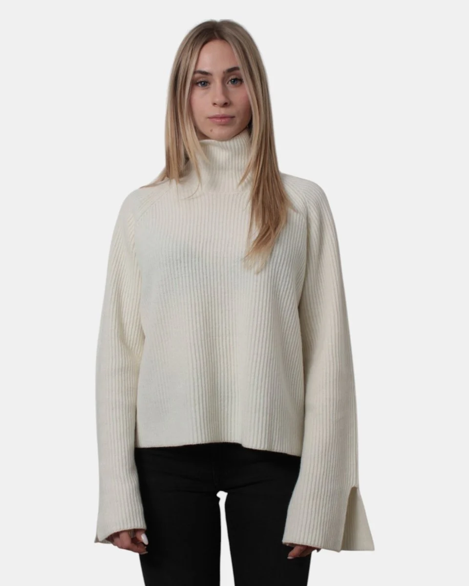 La maglia a dolcevita di Jucca presenta fantasia a coste e vestibilità over, dalla mano morbida e calda dovuta alla sua composizione in 100% lana vergine. La modella è alta 1,67 m e indossa una L