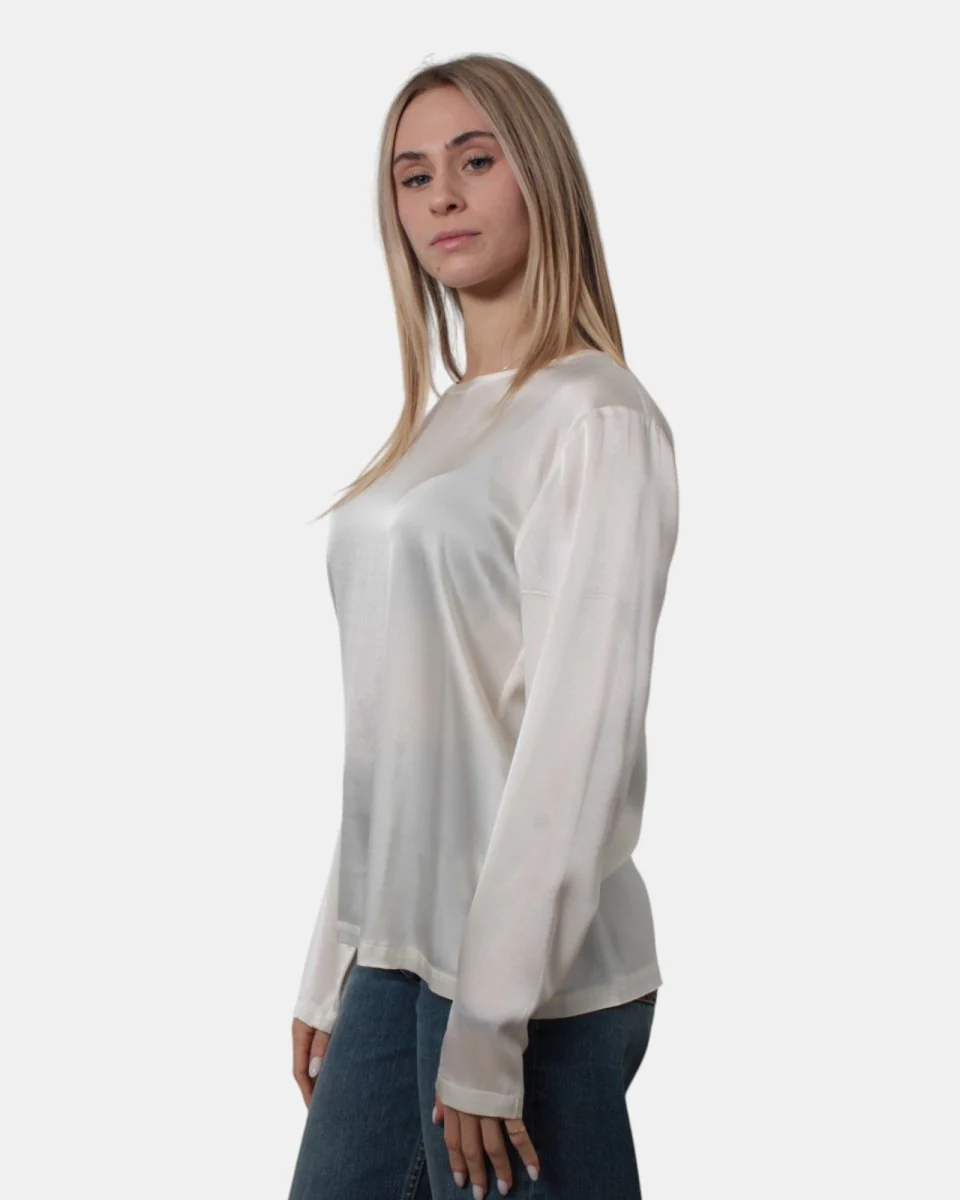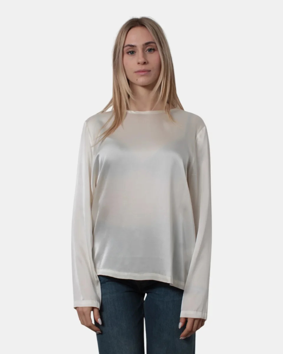 La maglia a maniche lunghe di Jucca presenta un’effetto morbido e avvolgente dovuto alla sua composizione in 94% seta e 6% elastan. Si consiglia di non lasciare il capo in ammollo. La modella è alta 1,67 m e indossa una 46