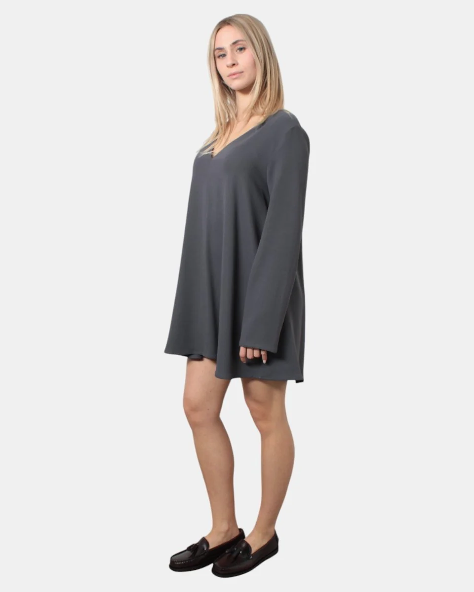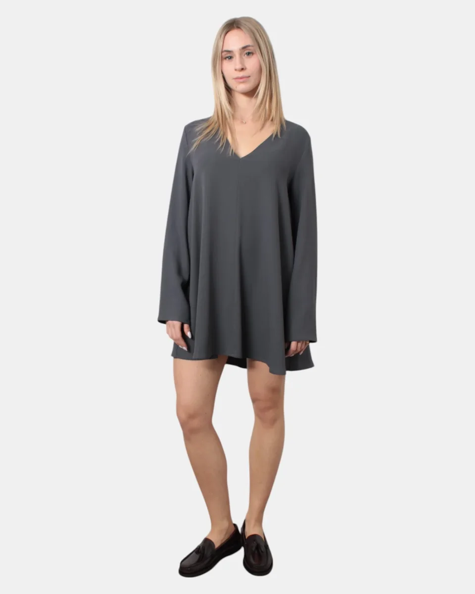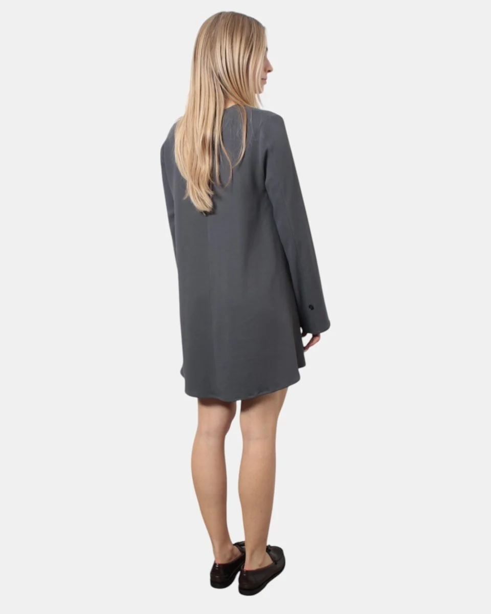L’abito di Jucca presenta scollo a V, maniche con chiusura a bottoni. Dalla mano soffice dovuta alla sua composizione in 96% viscosa e 4% elastan. La modella è alta 1,67 m e indossa una 46