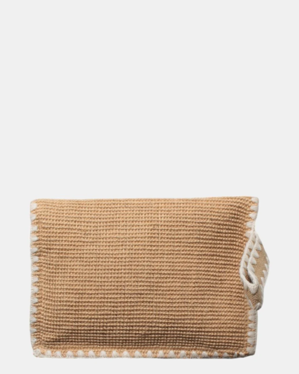 – DETTAGLI: Pochette MC2 Saint Barth in juta di colore beige. Modello Jute envelope lavorato artigianalmente con bordature bianco ricamate in contrasto e polsiera. Chiusura a patta con logo St. Barth ricamato in bianco.