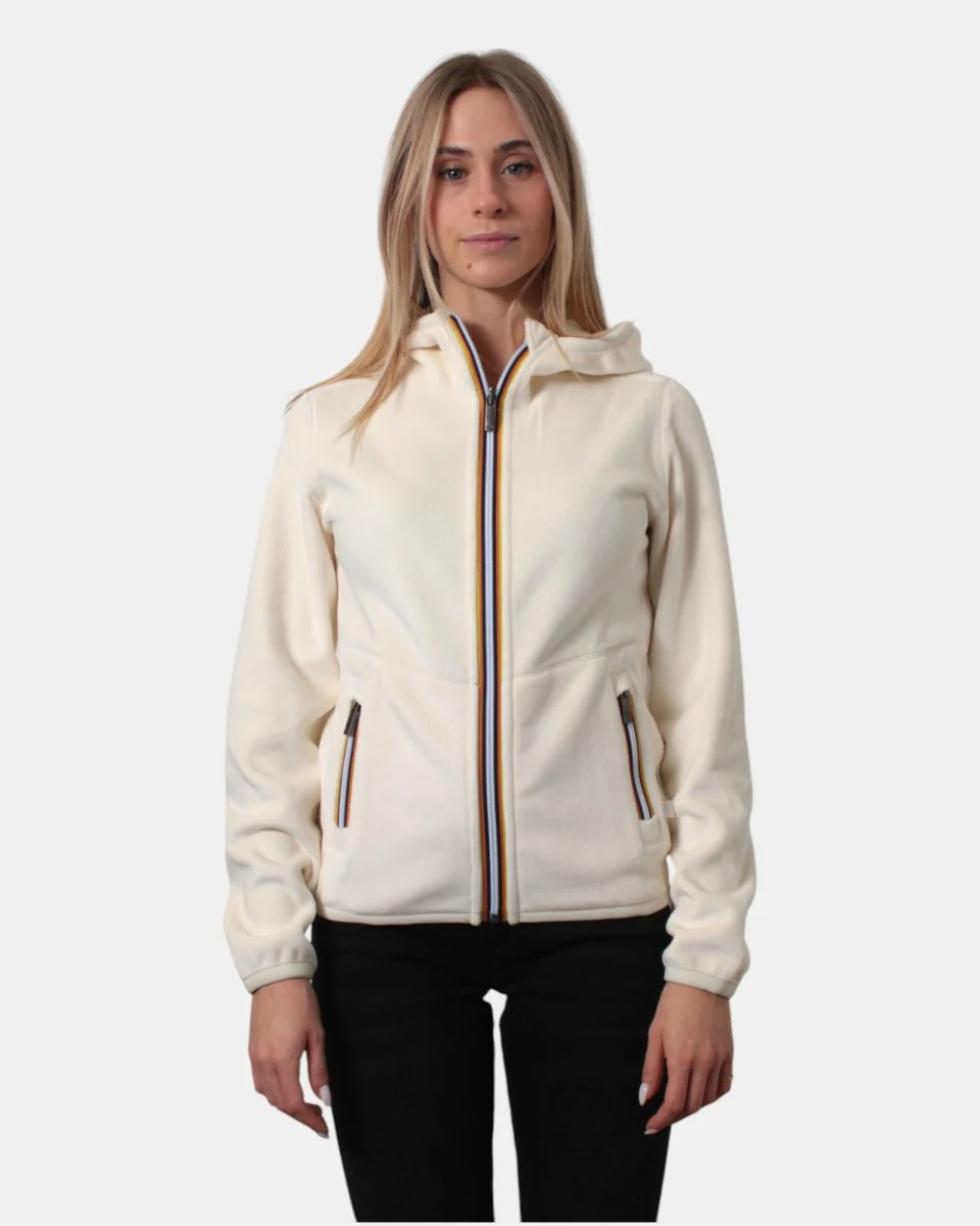 La felpa con cappuccio di K- Way presenta chiusura frontale con zip, due tasche con zip, dal tessuto in effetto vellutato, dalla mano calda e morbida dovuta alla sua composizione in 95% poliestere e 5% spandex. Si consiglia lavaggio a max 30 gradi. La modella è alta 1,69 e indossa una XS
