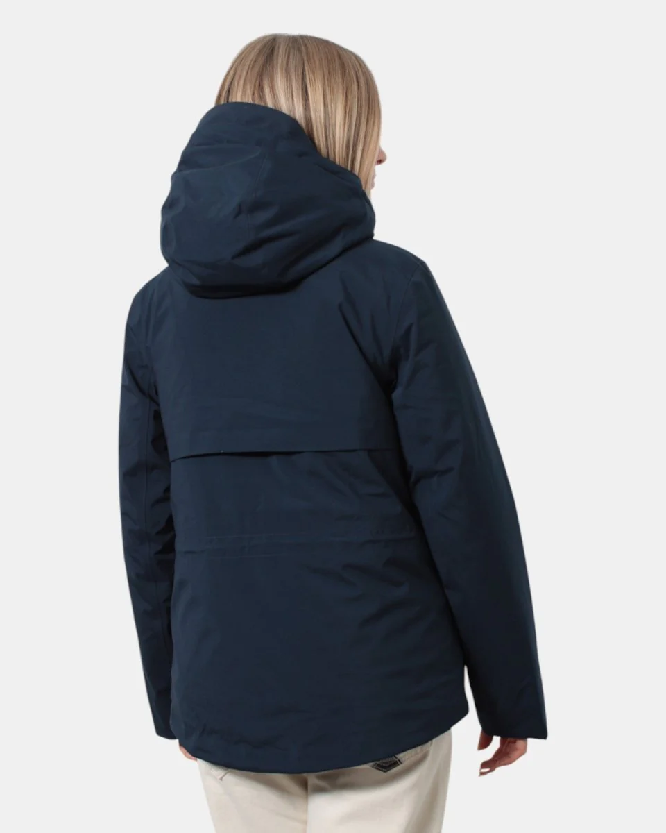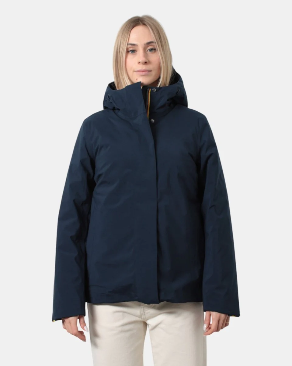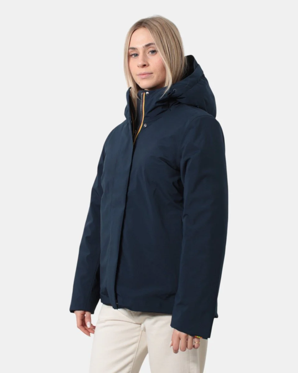 Il giubbotto con cappuccio di K-Way presenta chiusura frontale con zip, due tasche frontali oblique con chiusura a bottone e maniche con elastico. Presenta losanghe oblique internamente ed è composto per il 76% da poliestere e per il 24% da poliuretano. Si consiglia lavaggio delicato a max 40 gradi. La modella è alta 1,65 m e indossa una L