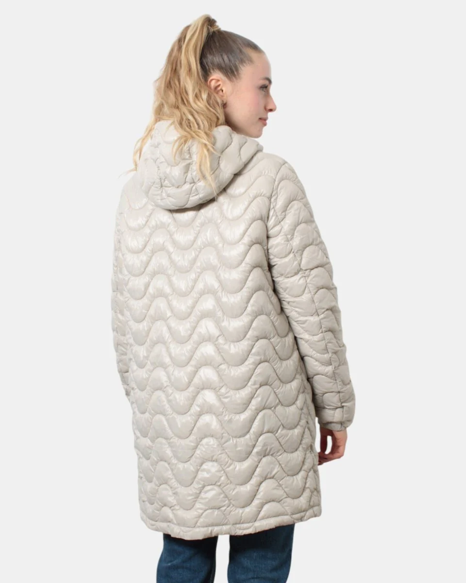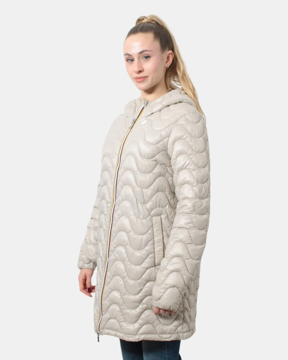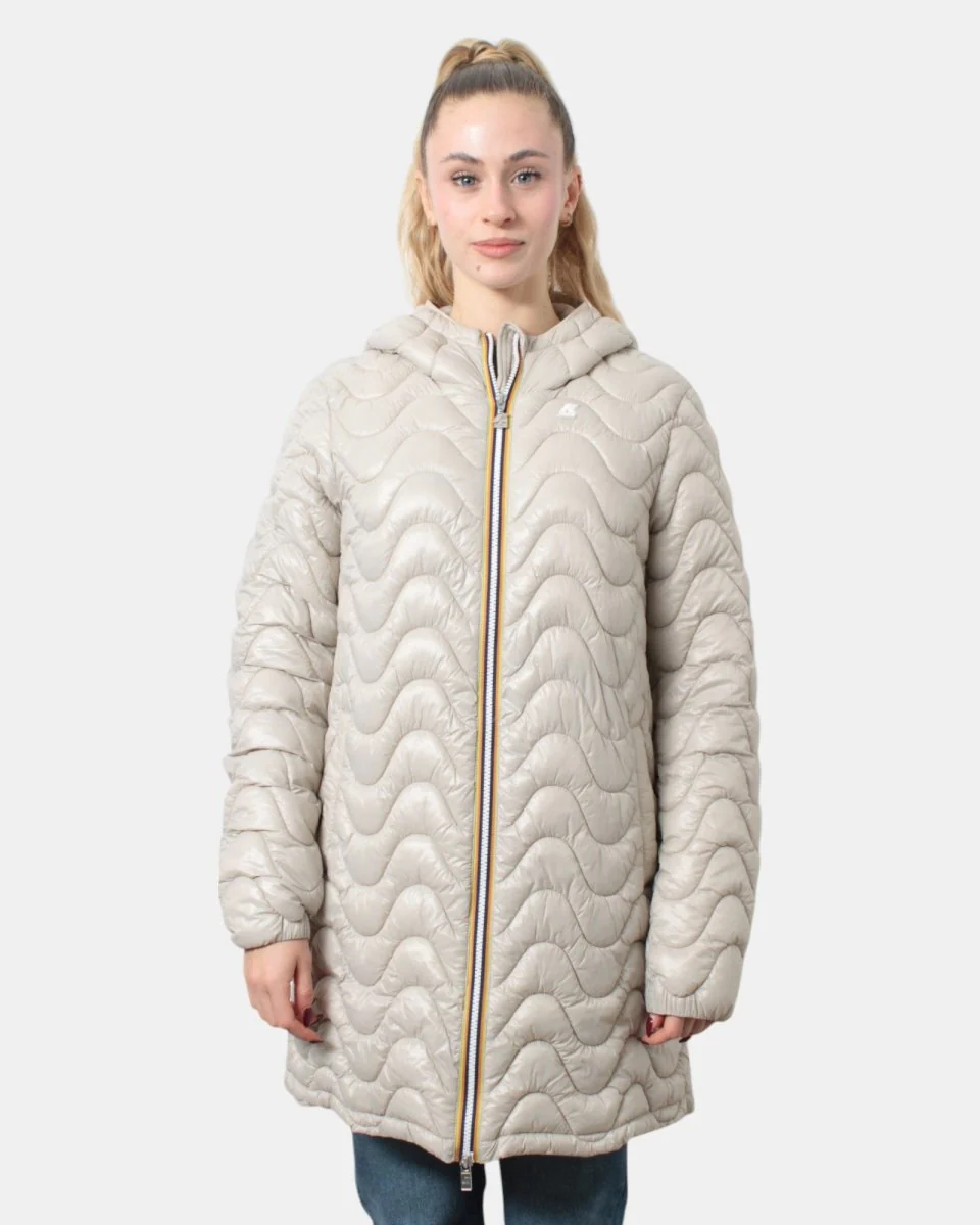 Il giubbotto lungo con cappuccio di K-Way presenta chiusura frontale con zip con losanghe ondulate, due tasche frontali oblique con chiusura a bottone e maniche con elastico. Internamente è composto per il 52% da poliammide e per il 48% da poliammide riciclato. Si consiglia lavaggio delicato a max 40 gradi. La modella è alta 1,65 m e indossa una L
