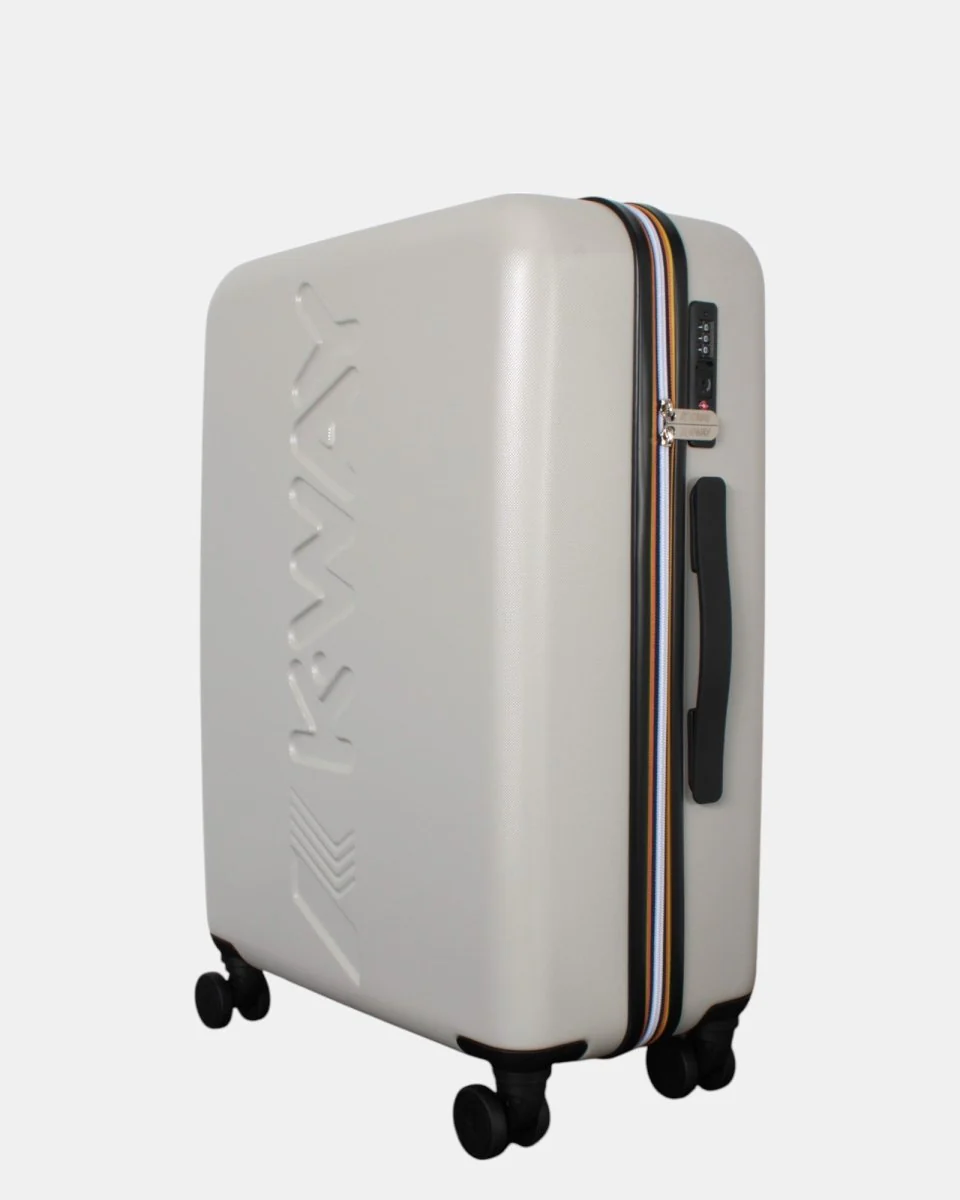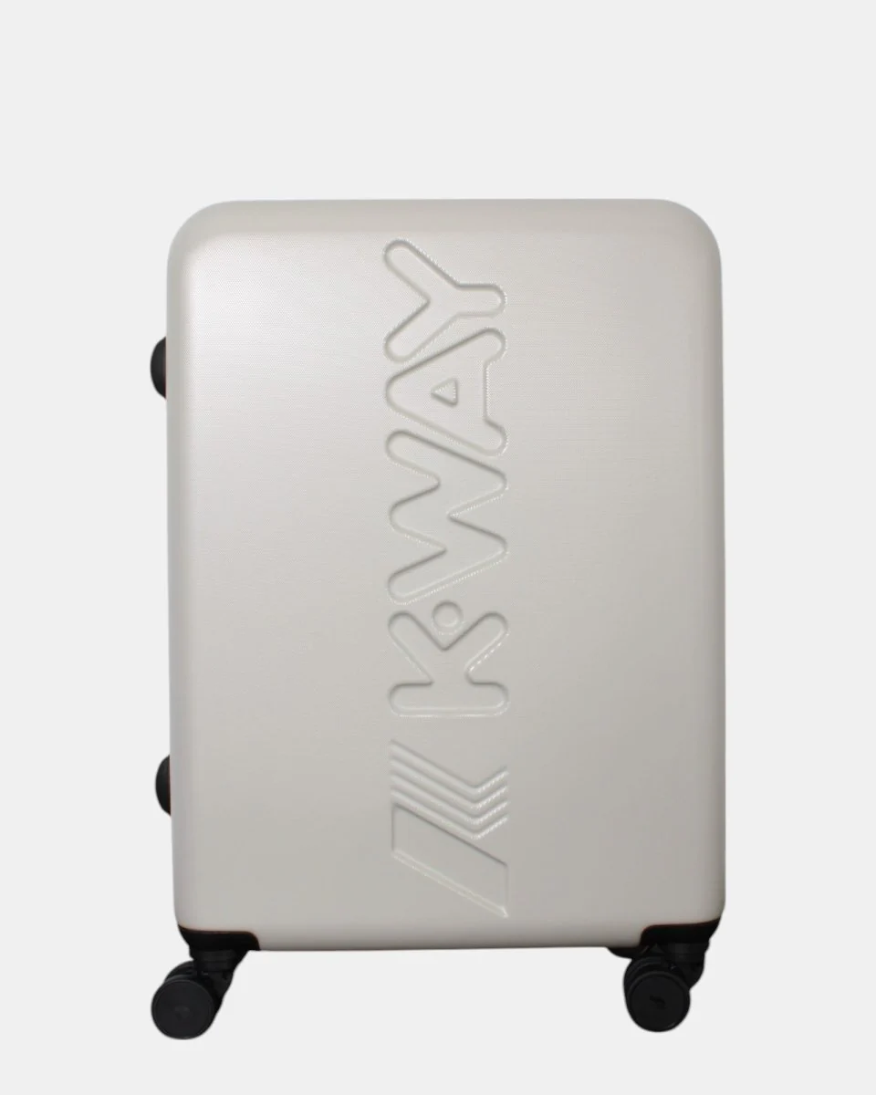 Il trolley di K Way è realizzato in acrilica e polipropilenica. Il modello K-Air presenta logo incavato sul fronte, fodera in poliestere con stampa allover logo, due tasche interne con zip, elastici incrociati multicolor, chiusura con zip doppio cursore logata, combinazione e TSA, maniglia estensibile in alluminio e quattro ruote girevoli a 360°. Le dimensioni dell’articolo sono cm 56 x cm 42 x cm 24