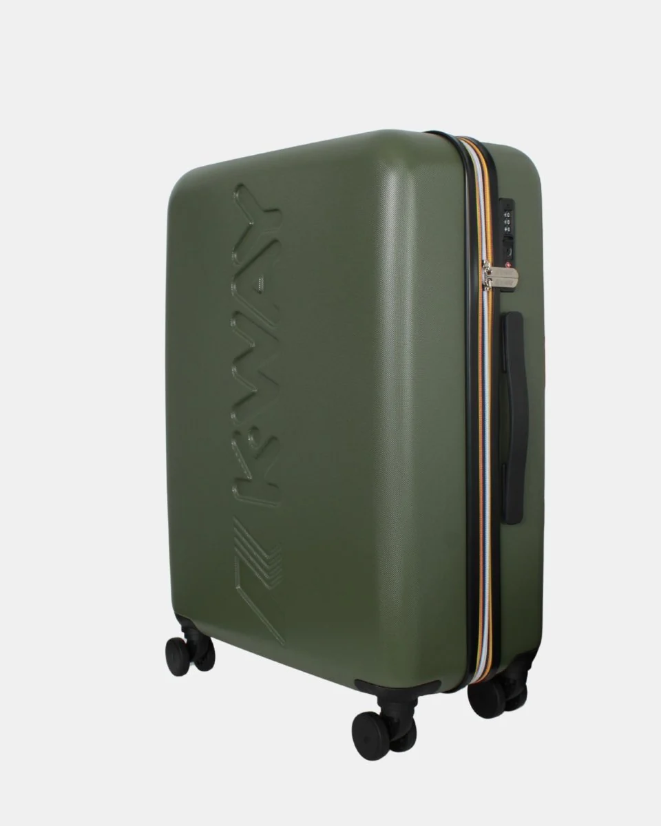 Il trolley di Kway presenta 4 ruote doppie personalizzate e girevoli a 360°, Sistema di chiusura con combinazione e Maniglia estensibile in alluminio