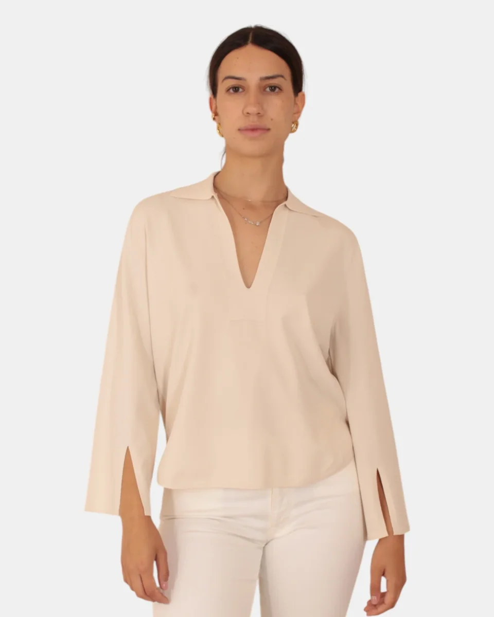La polo a v di Kangra presenta una manicha 3/4 con spacco, composizione in 83% VISCOSA 17% POLIESTERE. Si consiglia lavaggio a mano. La modella è alta 1,68 m e indossa una S