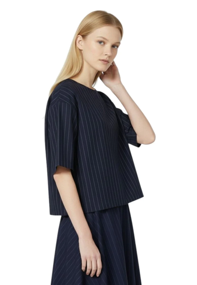 Semplice ma ricercata, la casacca da donna MM Max Mara è realizzata in morbido jersey di viscosa, pensata per offrire comfort e stile in ogni momento della giornata. Il motivo gessato a contrasto dona al capo un tocco grafico e contemporaneo, perfetto per chi ama un’eleganza discreta ma distintiva. La linea boxy, ampia e rilassata, è valorizzata da uno scollo a barchetta e da maniche corte a giro basso, che conferiscono alla silhouette un profilo moderno e femminile.